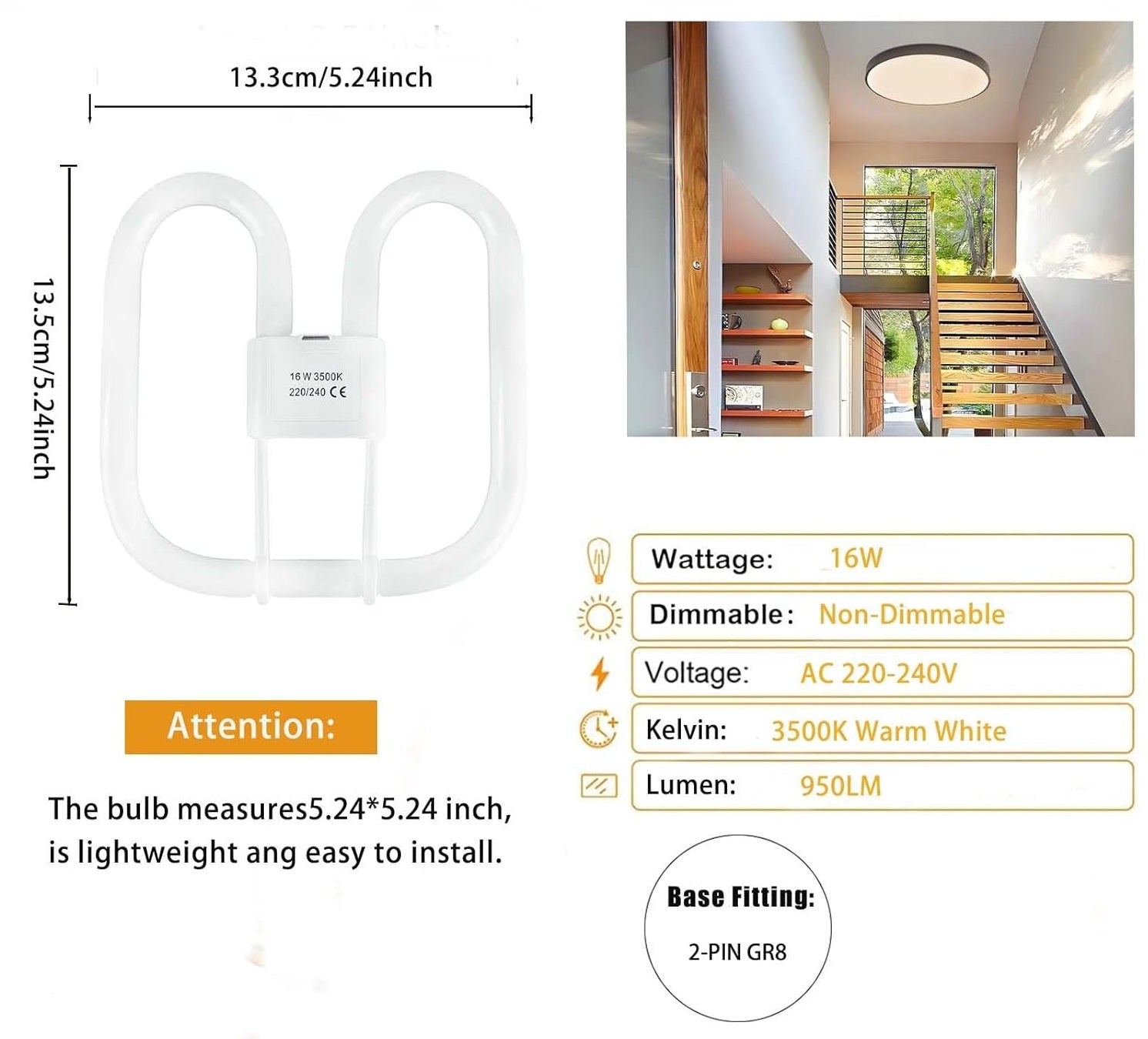GR8 16W Compact Fluorescent Light Bulb, Warm White 3500K Energy-Saving CFL Lamp, Non-Dimmable 2-Pin Design for Ceiling and Indoor Use, AC 230V