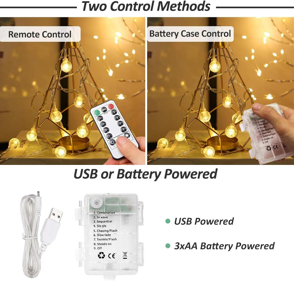 Add a magical glow to your indoor or outdoor space with these 100 LED Globe Fairy String Lights. Stretching 15M (49ft) with warm white illumination, these lights offer 8 dynamic lighting modes, dual power options (USB or battery), and remote control functionality. Perfect for cozy bedrooms, festive gatherings, outdoor patios, or whimsical camping nights, these waterproof string lights are your go-to decorative solution year-round.