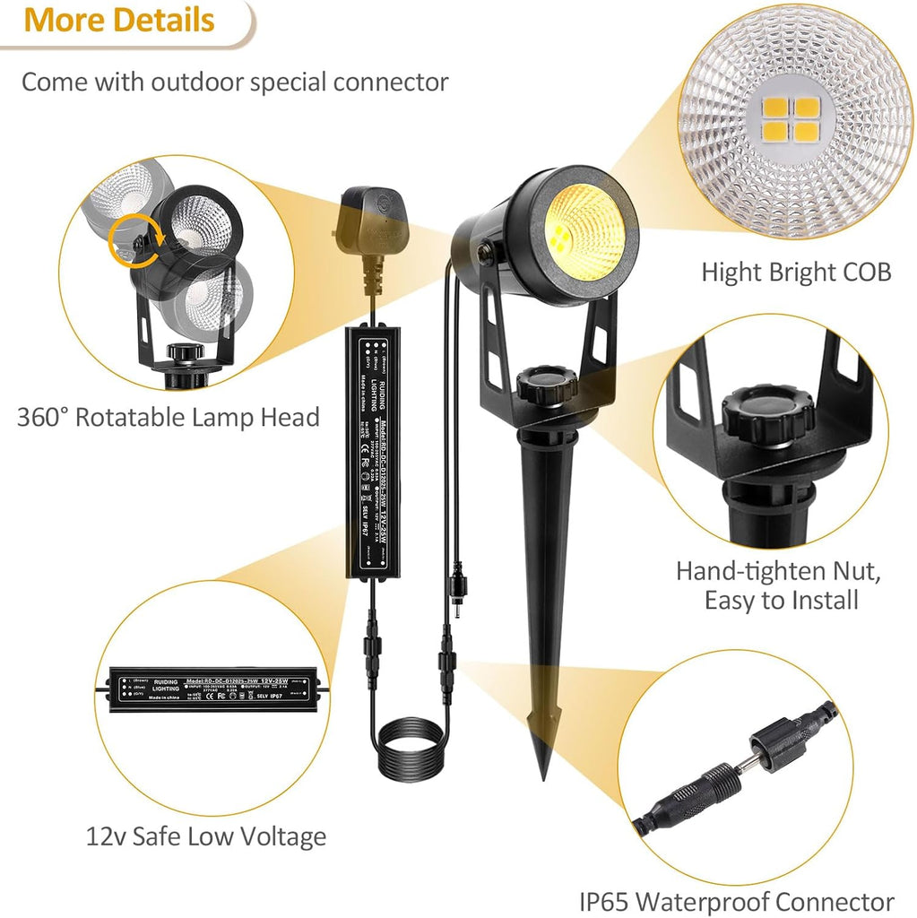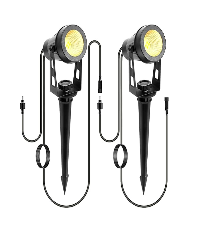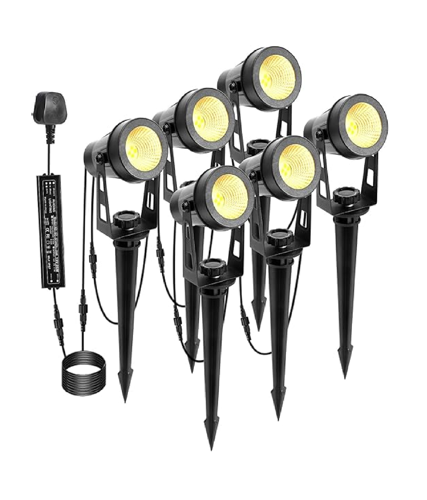 Illuminate your outdoor space with this powerful 6‑pack of mains-powered garden spotlights. Each 3 W LED lamp uses efficient COB chips to deliver a combined output of 1600 lumens—three times brighter than typical solar alternatives. The kit includes a 21 m extendable cable system and an IP65-rated design, ensuring robust performance in all weather conditions. With 12 V low-voltage safety and flexible spike or wall-mount installation, these spotlights are ideal for uplighting pathways, patios, flowerbeds, trees, walls, and more.