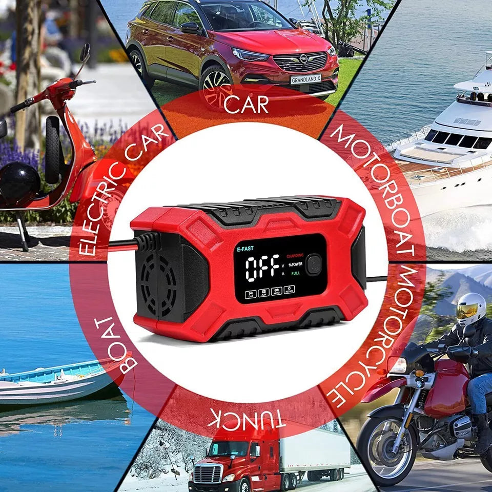 The New Smart Car Battery Charger is a powerful, multi-functional device designed to charge, repair, and maintain 12V batteries with precision and safety. This automatic jump starter and pulse repair charger is ideal for AGM, GEL, SLA, Wet, Lead-Acid, and Maintenance-Free batteries, ensuring optimal performance and extended battery life.