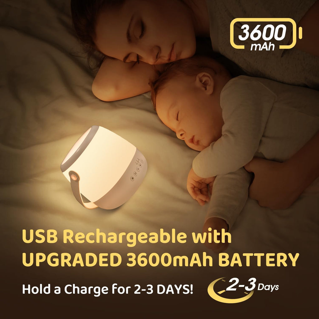 Make bedtime better and brighter with this USB rechargeable night light, featuring 12 white noise sounds, 35 RGB lighting effects, and portable cordless design. It's time to bring the perfect night light home for your little one.