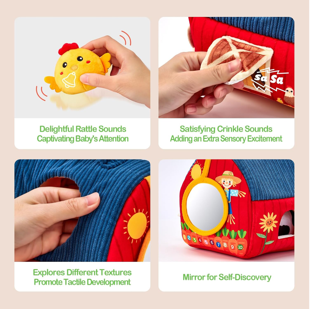 Bring learning and fun together with the Hahaland Baby Toys Farm Animal Set – designed to support sensory development and interactive play for infants and toddlers. This Montessori-inspired toy set includes adorable farm animals with a soft barn, rattle, crinkle paper, and mirror to keep little ones engaged while encouraging exploration and learning.