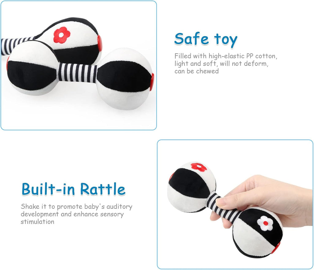 Shaped like maracas and dumbbells, these toys offer both fun and learning in one. The soft textures are safe for teething gums, while the high-contrast colors make them especially appealing for young babies whose eyesight is still developing.