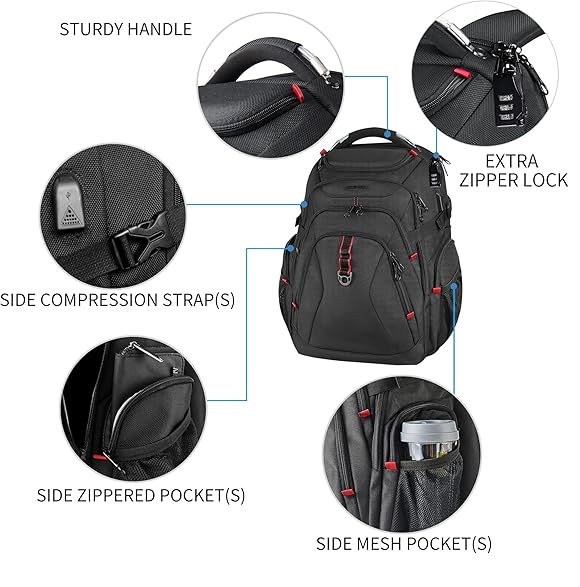 It features a large multi-compartment design that easily fits a 15.6"–17.3" laptop, books, clothes, and travel accessories. The built-in USB charging port lets you charge devices on the go, while the anti-theft back pocket ensures your valuables stay secure.