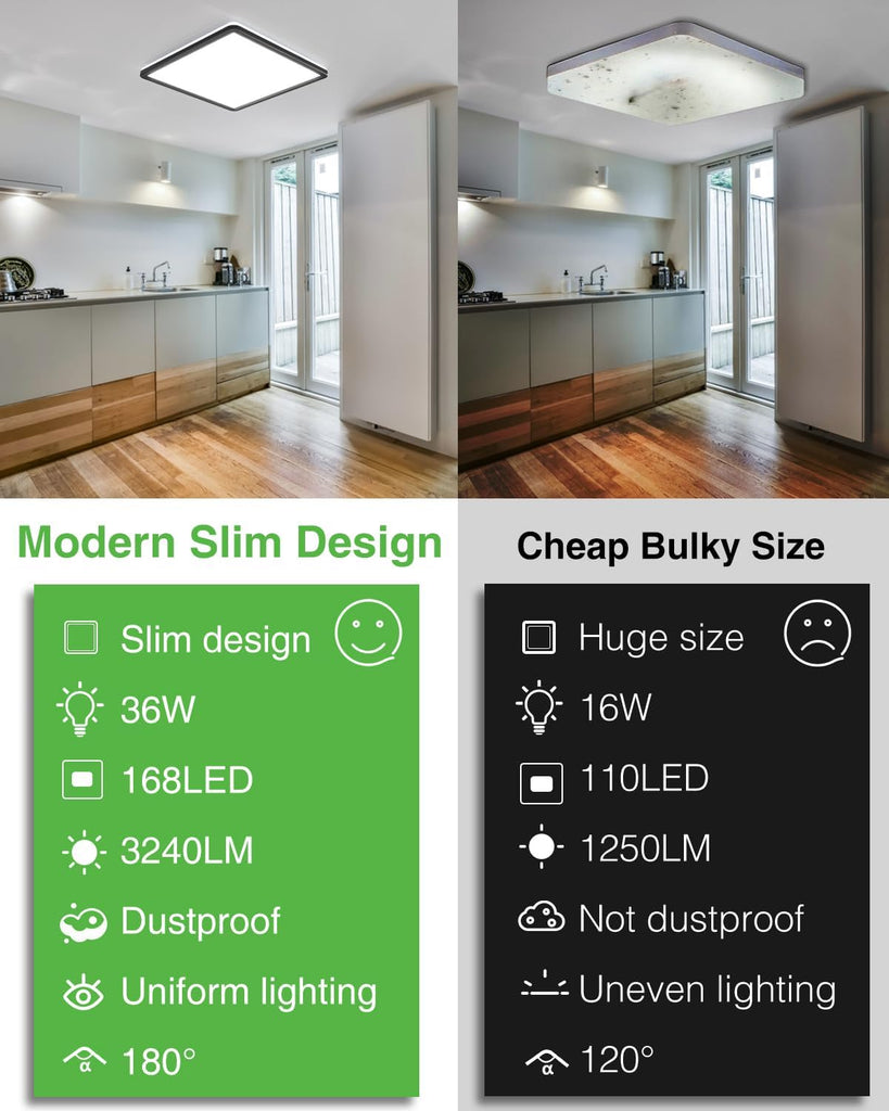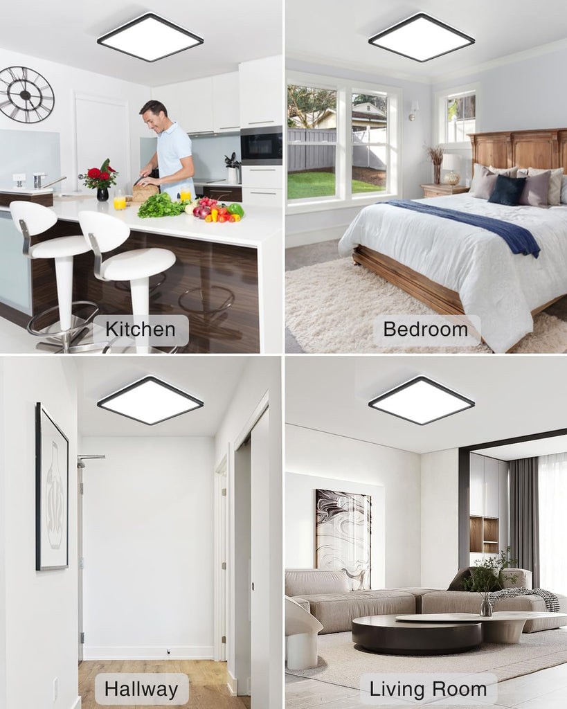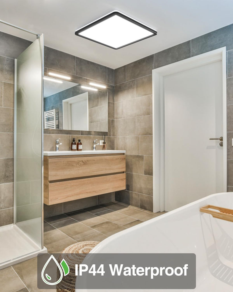 Enhance your home with this 36W LED Ceiling Light featuring a modern square design and black frame. With a super bright daylight white output (3300LM) and waterproof construction, it’s ideal for a wide range of indoor spaces including bathrooms, kitchens, and living areas.