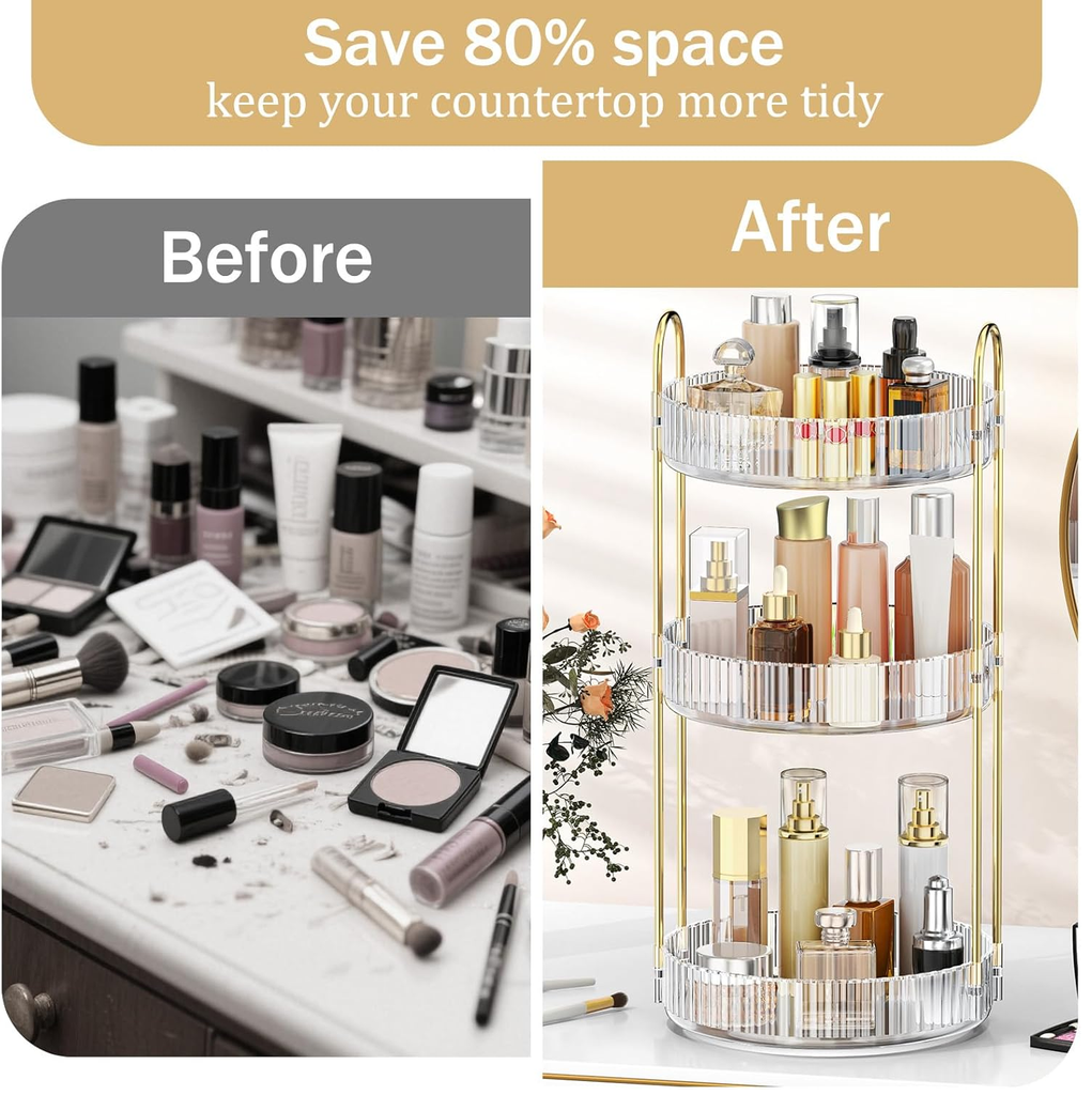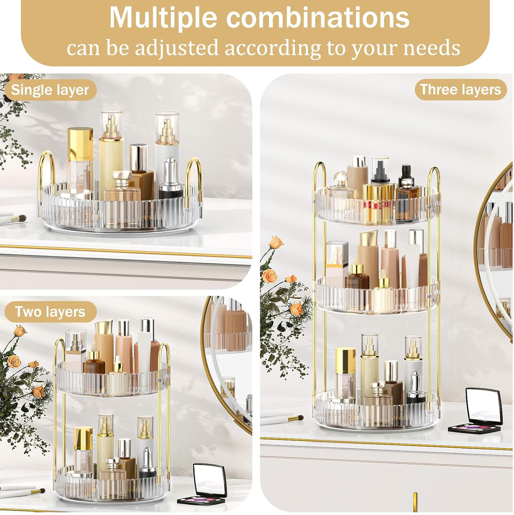The 360-degree rotating base allows you to instantly access any product with a smooth spin, eliminating clutter and saving time during your daily beauty routine. Featuring three spacious, adjustable tiers, this stand accommodates items of various sizes — from tall lotion bottles and perfume sprays to compact lipsticks and brushes.