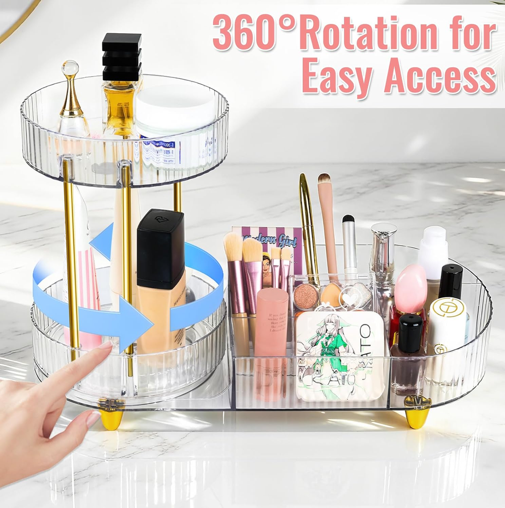 Bring order and elegance to your beauty routine with this 360° Rotating Makeup Organizer, the ultimate solution for keeping your cosmetics, skincare, and perfumes beautifully arranged. Designed with a 2-in-1 rotating compartment system, this clear acrylic organizer offers both upper and lower tiers for customizable storage that adapts to your collection.