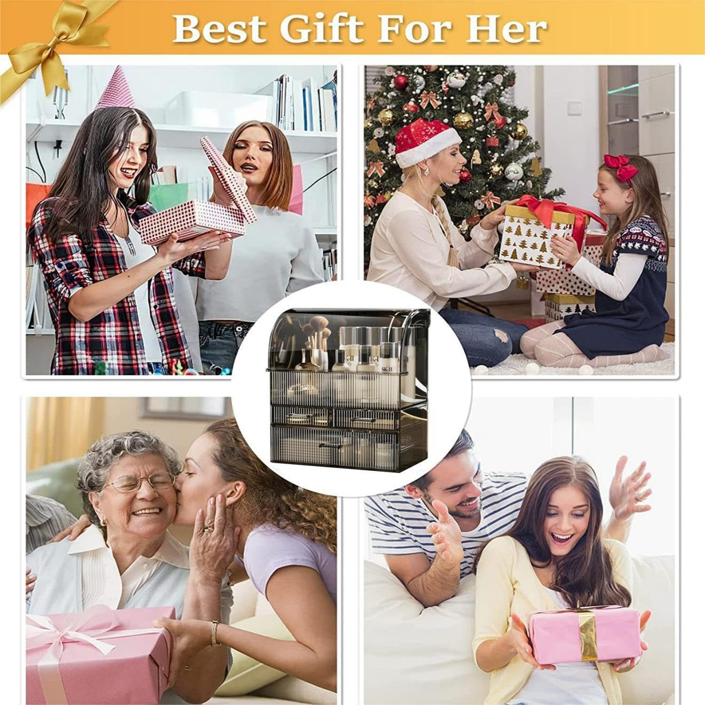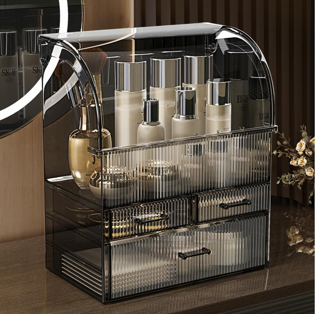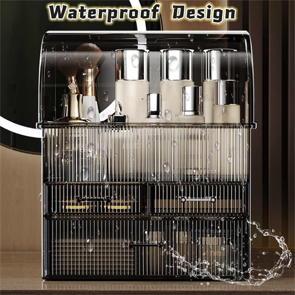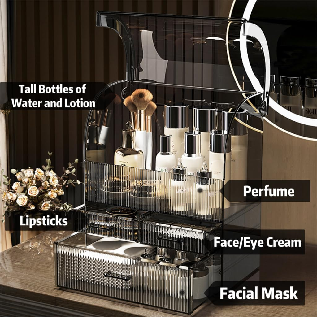 Featuring a large multi-tier design with multiple drawers and compartments, it offers generous space to neatly arrange skincare bottles, cosmetics, brushes, perfumes, and accessories. The transparent structure provides full visibility, so you can easily locate items without rummaging through clutter, while the waterproof and dustproof cover protects your products from moisture and dirt.