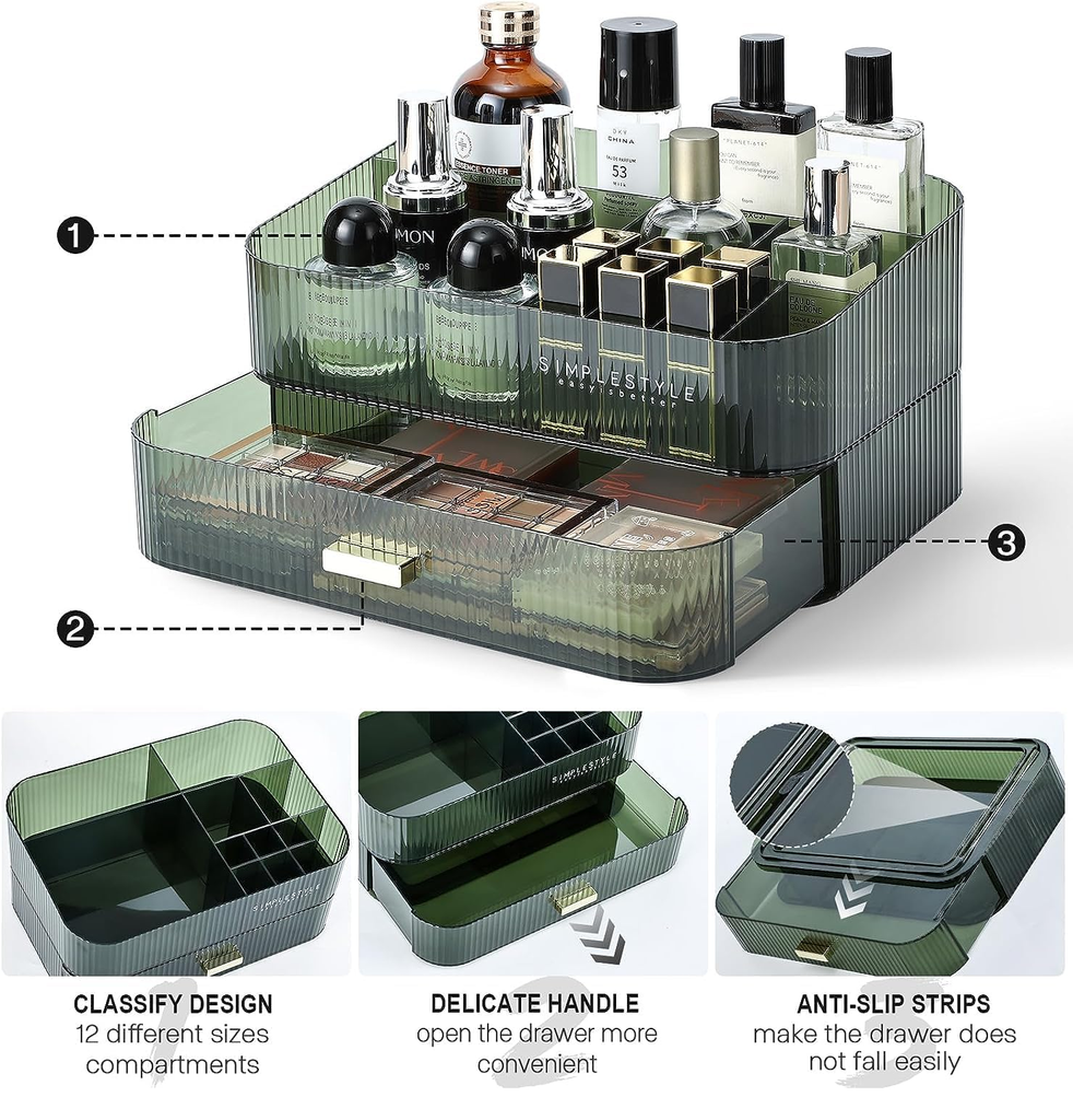 Crafted from high-quality, transparent acrylic with a vibrant green tint, it combines modern design with lasting durability. The smooth-sliding drawers allow effortless organization of smaller items like lipsticks, brushes, and nail polish, while the spacious compartments hold taller bottles, perfumes, and skincare products.