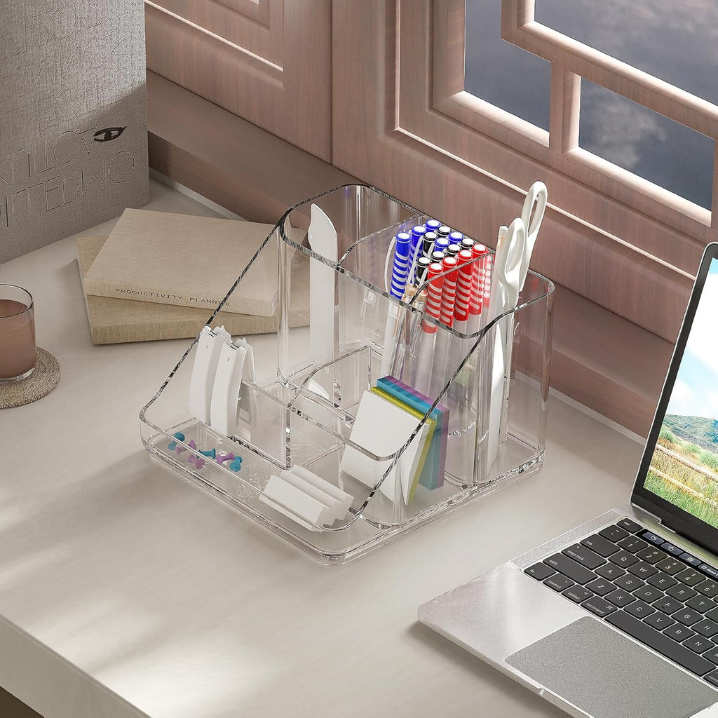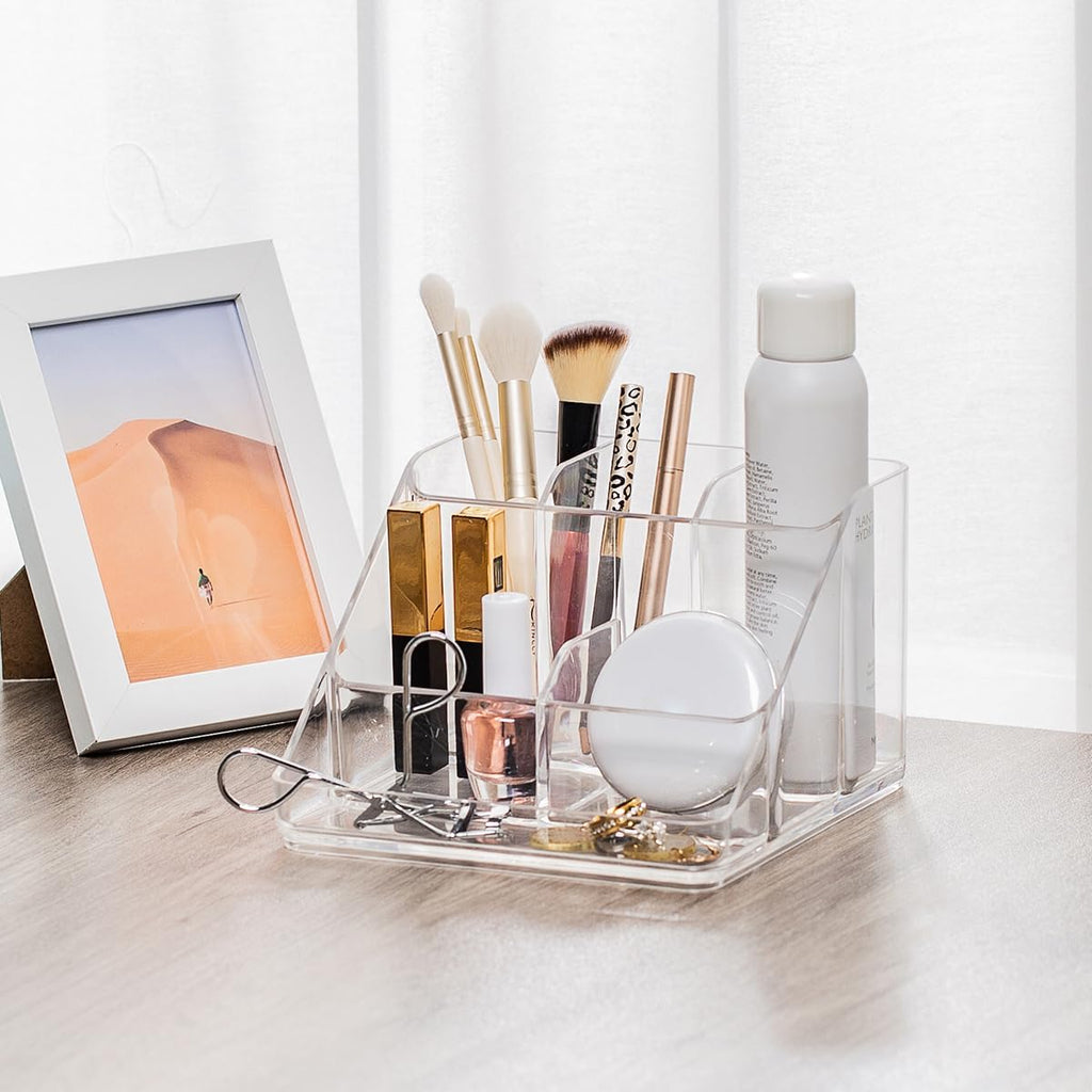 Keep your essentials perfectly organized with this elegant Makeup Organiser Tray, designed with six spacious compartments to store cosmetics, jewelry, skincare, and stationery items with ease. Made from high-quality clear acrylic, this organizer combines durability with modern style, allowing you to see all your items at a glance while keeping your countertop neat and clutter-free. Its open-top design ensures quick access to your daily essentials, making it perfect for use on your vanity table, bathroom counter, office desk, or dresser. The crystal-clear finish enhances any décor, while its sturdy construction ensures long-lasting performance. Ideal for makeup lovers, beauty professionals, and organized spaces, this multi-functional storage tray adds both convenience and sophistication to your routine.