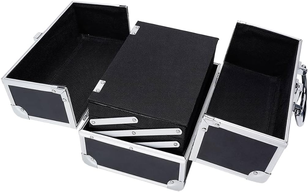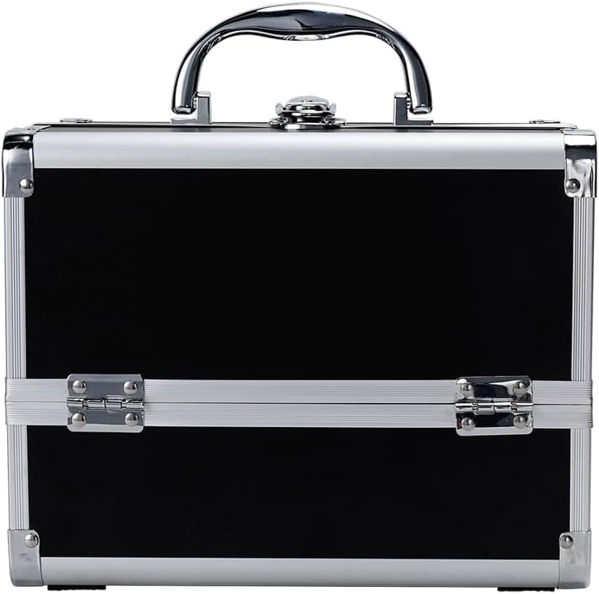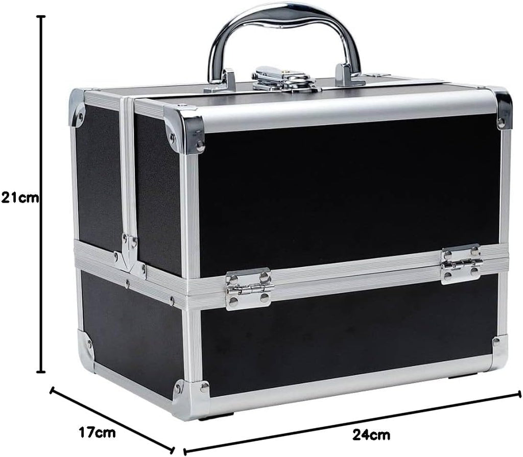 It features multiple layered compartments and adjustable dividers to neatly separate and store makeup brushes, foundations, lipsticks, skincare, jewelry, and beauty accessories. The secure closure system prevents items from spilling or shifting during travel, while the reinforced handle ensures easy portability. Its sleek black finish and modern design give it a professional and elegant appearance suitable for makeup artists and beauty enthusiasts alike.