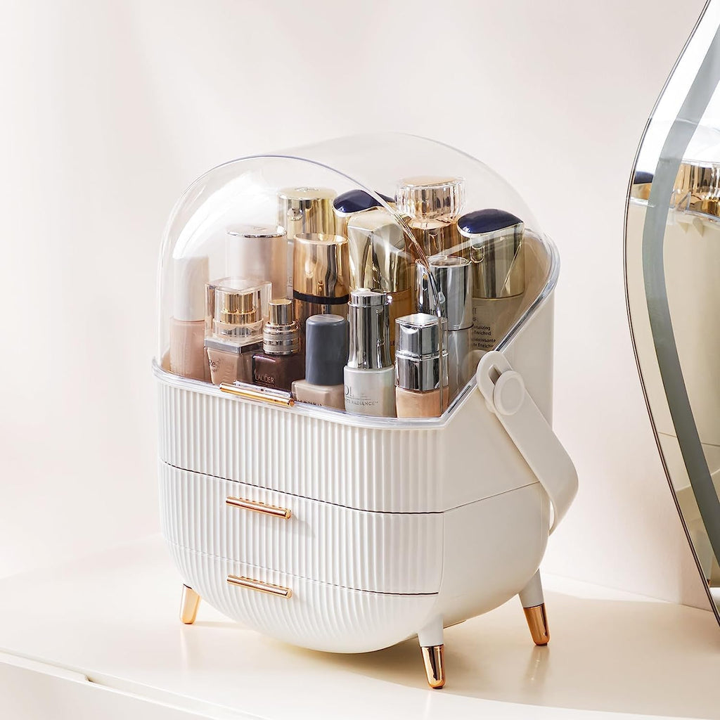 Spacious Storage Capacity: Multiple compartments and drawers fit skincare bottles, creams, and accessories.