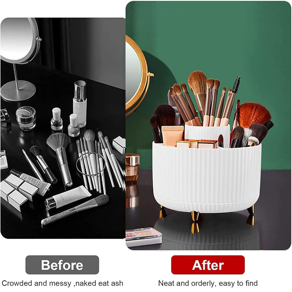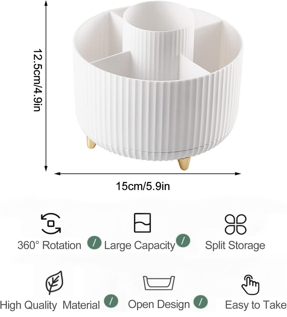 Keep your vanity or workspace effortlessly organized with this elegant Rotating Makeup Organizer with Brush Holder in classic white. Designed with 5 spacious compartments and a smooth 360° rotating base, it allows you to easily access your cosmetics, brushes, perfumes, and accessories from any angle.