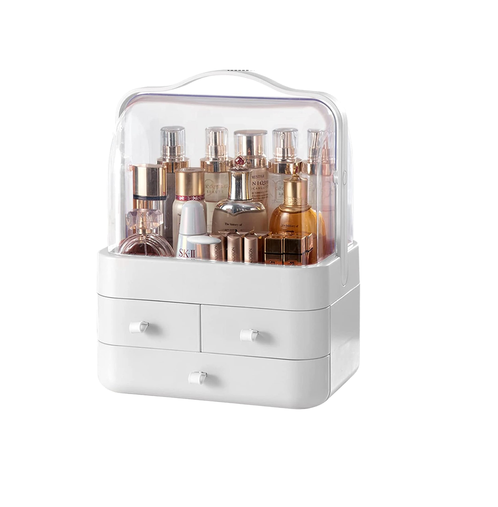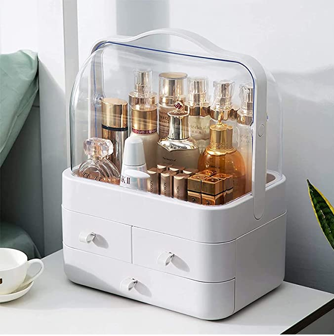 Made from high-quality, durable materials, it’s perfect for bathroom countertops, vanity tables, and dressing rooms. The transparent cover keeps your products visible and protected from dust and moisture, while the drawers provide extra space for small items like lipsticks and jewelry.