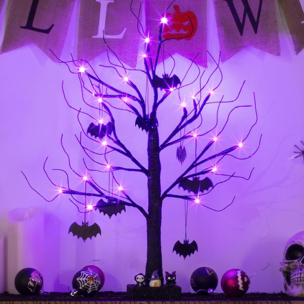 Bring spooky elegance to your Halloween décor with this 2FT Black Halloween Tree, featuring sparkling black glitter branches and 24 glowing purple LED lights. Standing 60cm tall, this decorative twig tree is adorned with 8 metal bat plaques, creating a festive and eerie atmosphere perfect for Halloween parties, window displays, or tabletop decorations. The push-button switch offers simple operation with on/off and 6-hour timer settings, so you can enjoy effortless illumination all evening. Crafted for safe and creative DIY fun, its bendable branches let kids and adults personalize their own Halloween tree. Powered by 3×AA batteries (not included), this lightweight and reusable decoration makes a charming gift for kids or a standout piece for your haunted home.