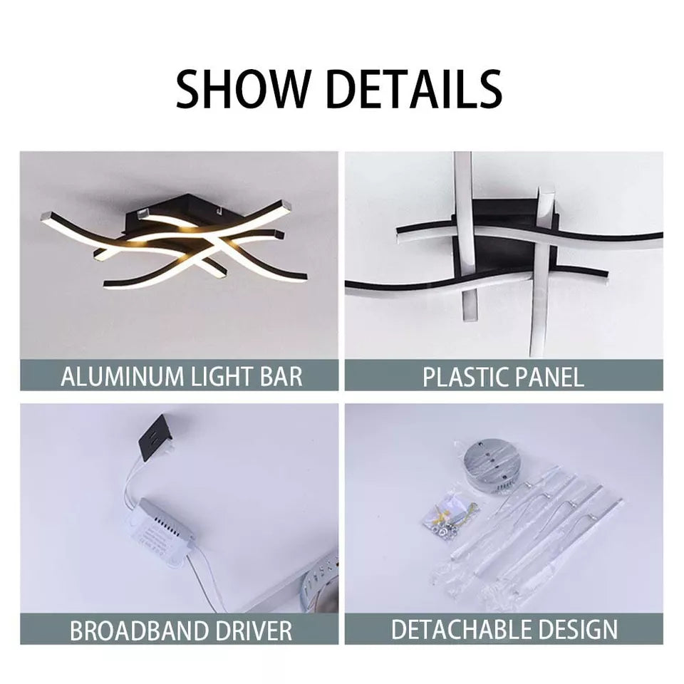 Featuring a unique four-wave shape, this ceiling light is a true statement piece that blends artistic design with practicality. Its sleek metal frame with a high-quality finish gives it a sophisticated look, while the curved light bars create a dynamic and eye-catching effect. Whether mounted in the center of your living room, over a dining table, or in a stylish bedroom, this light fixture adds a touch of modern luxury to any space.