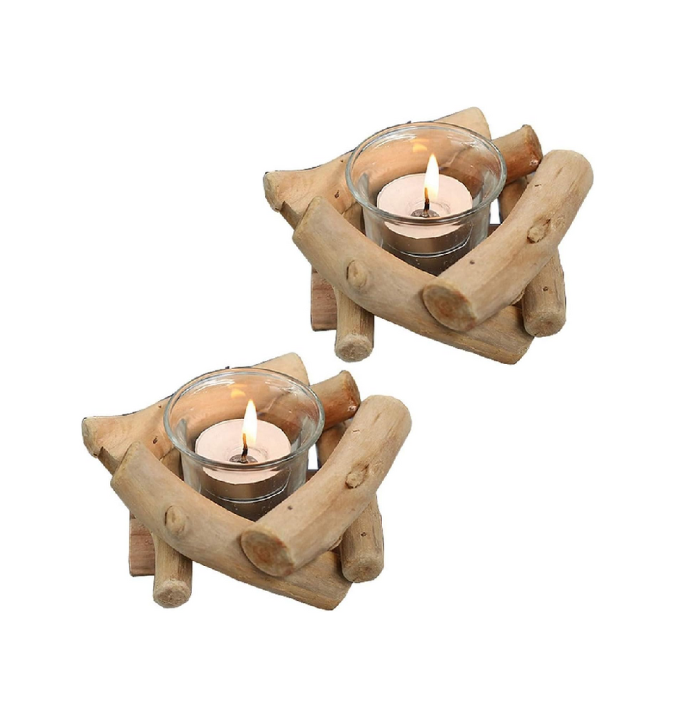 Create a cozy and natural ambiance with this Rustic Wooden Tea Light Candle Holder featuring a handcrafted driftwood design and a clear glass votive cup. When lit, the flame flickers beautifully through the wood structure, resembling a mini campfire, adding warmth and charm to any space. Each piece is handmade, ensuring every holder has a unique texture and finish that celebrates the beauty of natural materials. Perfect for farmhouse décor, wedding centrepieces, or coffee table accents, this elegant holder brings a touch of nature indoors. Whether you’re creating a romantic setting or simply adding rustic style to your living room, it’s a timeless decorative piece for any occasion.