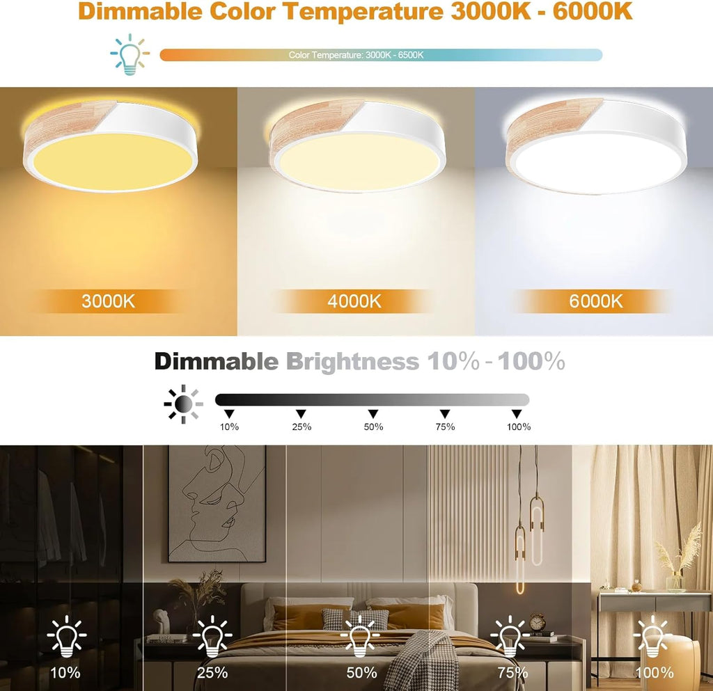 Bring natural elegance and modern functionality to your home with this Wooden Dimmable LED Ceiling Light. Crafted from high-quality natural oak, it’s resistant to insects, corrosion, and oxidation while adding warmth to any room. Featuring 3 adjustable color temperatures (3000K–6000K) and 10–100% dimming, this ceiling light adapts to every occasion—from cozy evenings to bright workspaces.