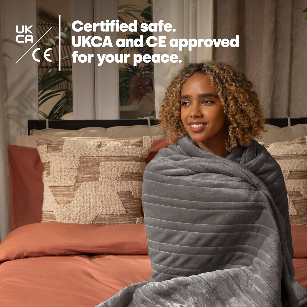 Stay warm and cozy during cold nights with this Electric Heated Throw Blanket in soft grey fleece. Measuring 160x130cm, this blanket offers generous coverage and luxurious softness, perfect for relaxing on the sofa or in bed. With 9 adjustable heat settings and an easy-to-use digital controller, you can personalize your comfort level. The built-in timer and automatic shut-off ensure safety and energy efficiency, while the low voltage design keeps power consumption minimal. Designed with detachable controls, this heated blanket is machine washable, making it both practical and easy to maintain. Enjoy soothing warmth and relaxation all season long.