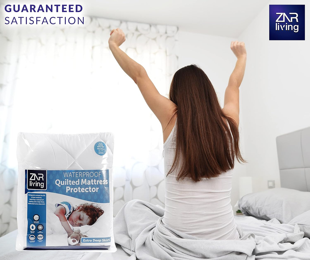 Protect your mattress with this premium Super King waterproof mattress protector, designed for maximum comfort and durability. The soft, breathable surface keeps you cool throughout the night, while the 100% waterproof backing shields your mattress from spills, sweat, and stains. Its 40 cm extra-deep fitted skirt provides a snug fit for thicker mattresses, ensuring it stays in place without slipping. Perfect for those with allergies, this protector is hypoallergenic, dust mite proof, and noiseless, offering clean, quiet, and healthy sleep every night. Machine washable for easy care, it extends the life of your mattress effortlessly.