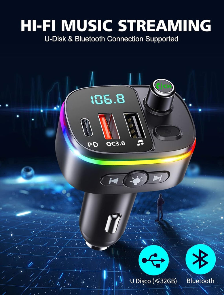 Upgrade your driving experience with the Bluetooth 5.3 FM Transmitter Car Adapter, a multifunctional device that combines fast charging, hands-free calling, and immersive LED lighting. Equipped with QC3.0 and PD 18W USB-C ports, it allows you to charge multiple devices quickly and safely while on the road. The advanced Bluetooth 5.3 technology ensures faster pairing, stable connections, and crystal-clear audio for music streaming and calls. Enjoy 9 dynamic RGB backlight modes that enhance your car’s interior atmosphere. The built-in microphone with noise reduction lets you make hands-free calls, and it’s fully compatible with Siri and Google Assistant for voice control. Compact, stylish, and powerful — this car adapter is the ultimate all-in-one accessory for modern drivers.