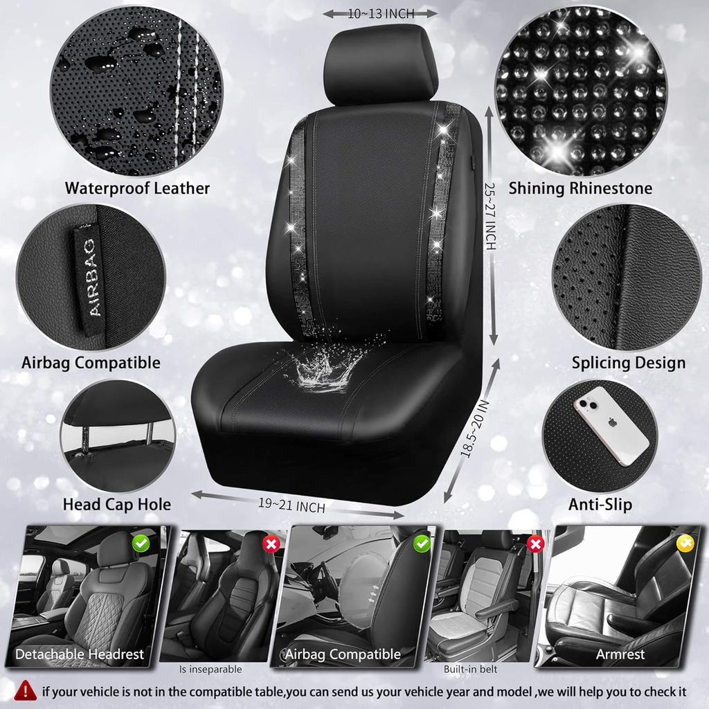 Transform your car interior with these Luxury Leather Diamond Bling Car Seat Covers, designed for women who love elegance and sparkle. Crafted from premium waterproof PU leather, these seat covers feature embedded rhinestones and glitter crystals that shimmer beautifully under any light — giving your car a glamorous and personalized touch. The universal fit design makes them suitable for 95% of cars, SUVs, and trucks, while the non-slip backing and secure straps ensure a snug, comfortable fit. The covers are soft, breathable, and wear-resistant, offering lasting protection for your original seats against spills, dirt, and daily wear. Perfect for anyone who wants to add a touch of style and comfort, these shining diamond seat covers turn your everyday drive into a luxury experience. Easy to install and clean, they’re an ideal gift for women and girls who love fashionable car accessories.