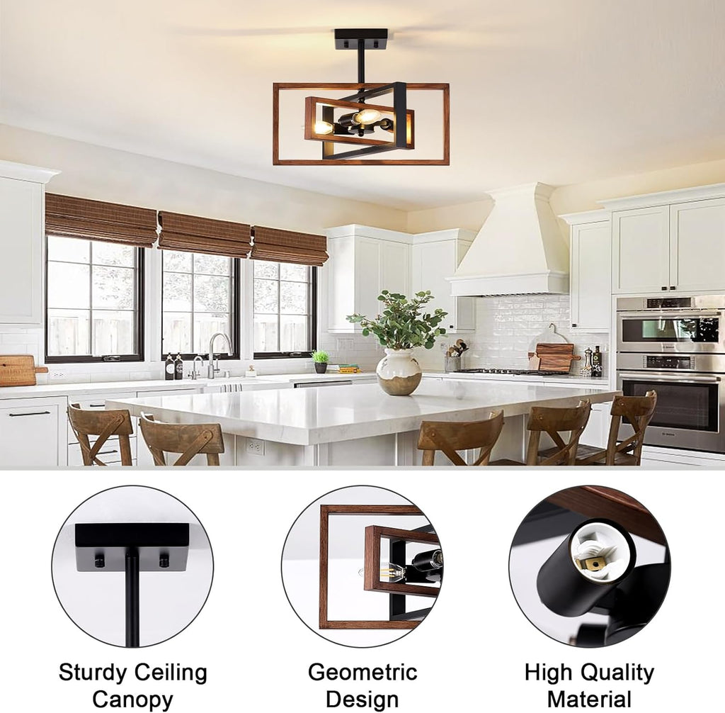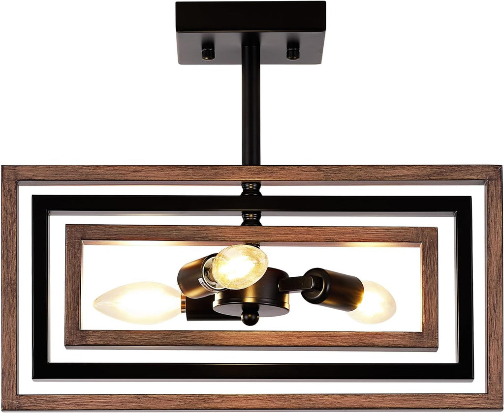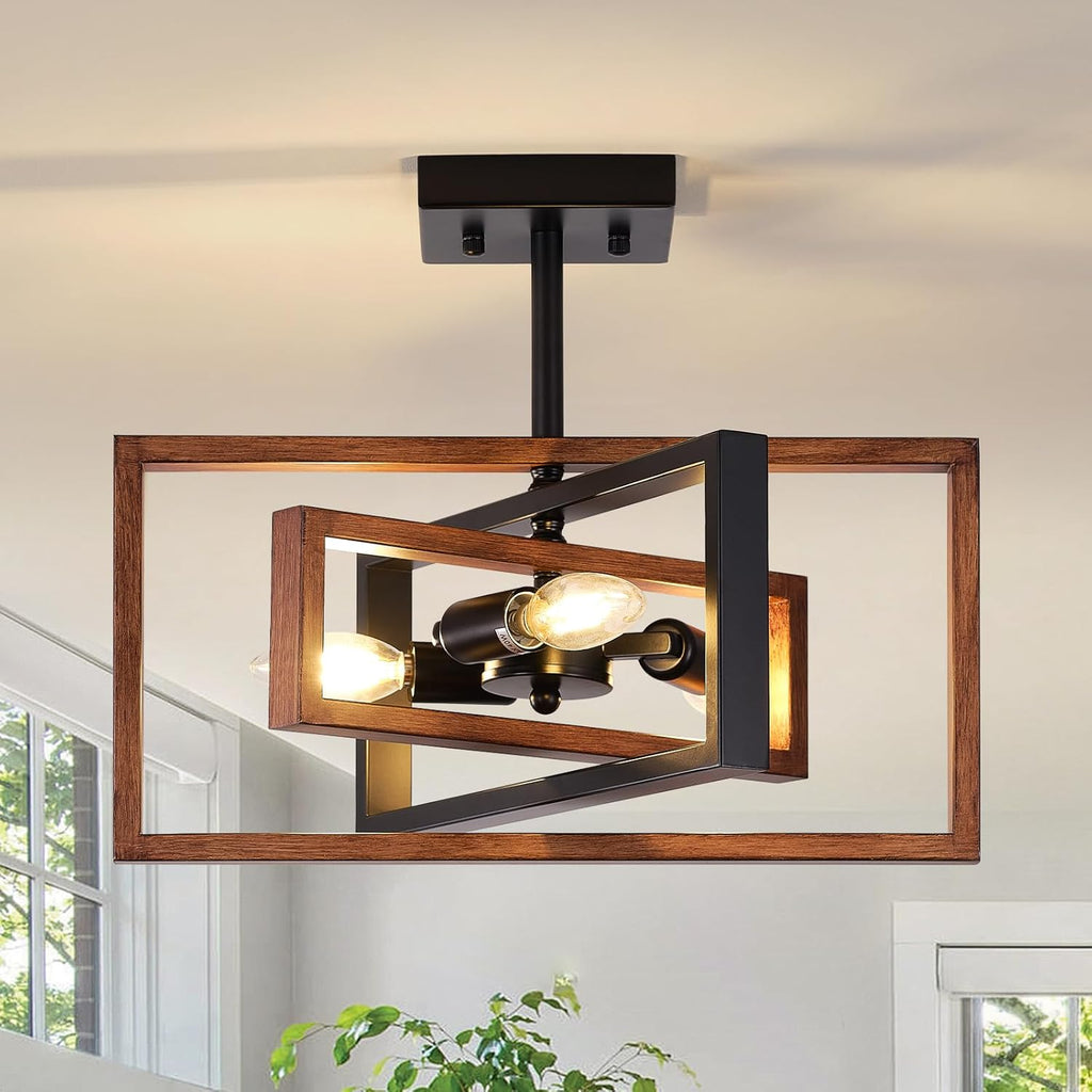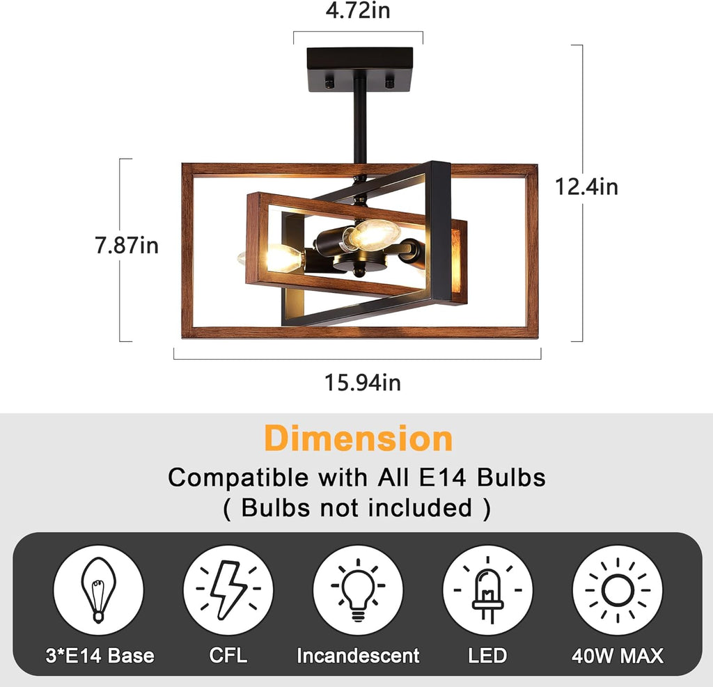 Add a bold and stylish industrial flair to your interiors with this Black 3-Light Semi Flush Mount Ceiling Light. Designed with intersecting geometric frames in matte black and woodgrain tones, this retro chandelier combines vintage charm with modern elegance. With E14 bulb compatibility and wide applicability across rooms, this fixture is perfect for living rooms, bedrooms, hallways, and kitchens. Built for durability and easy installation, it's the ideal lighting upgrade for modern and classic spaces alike.