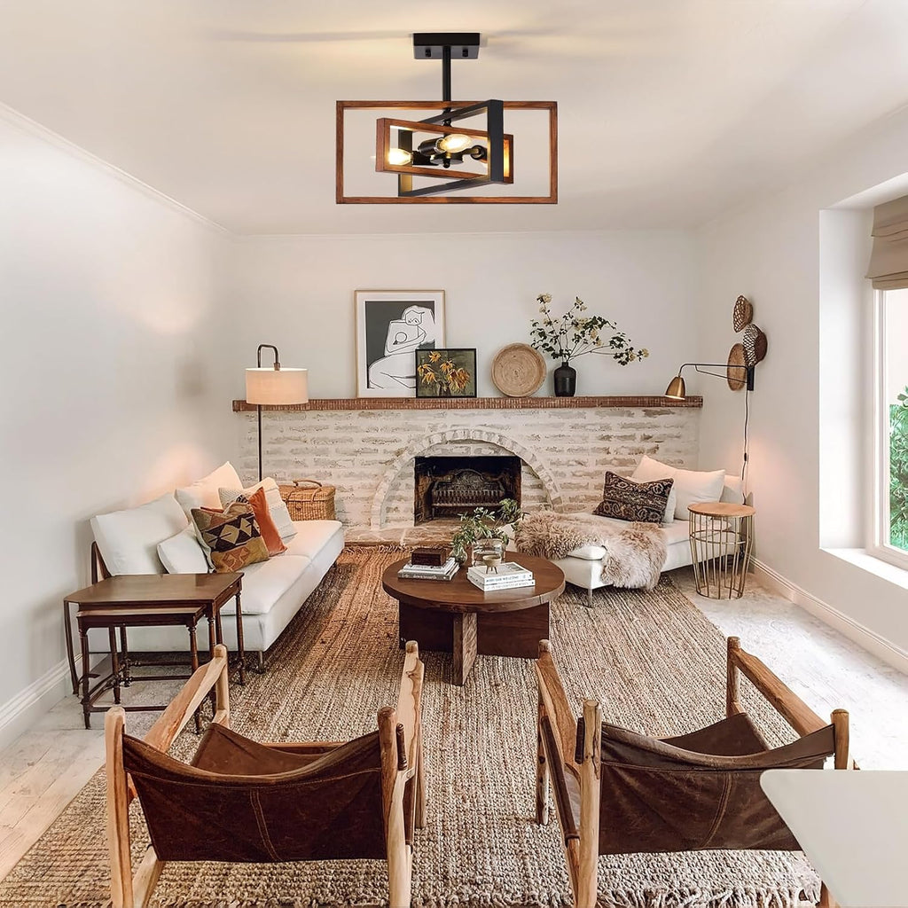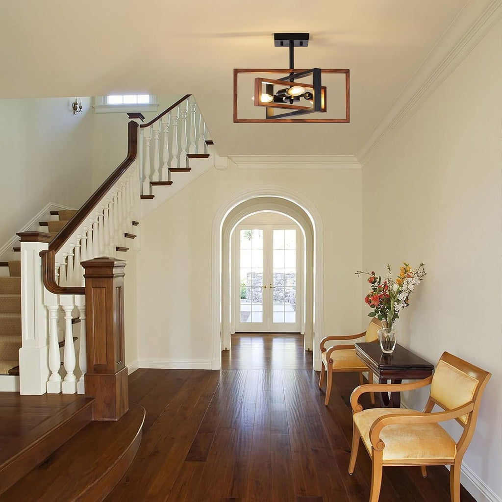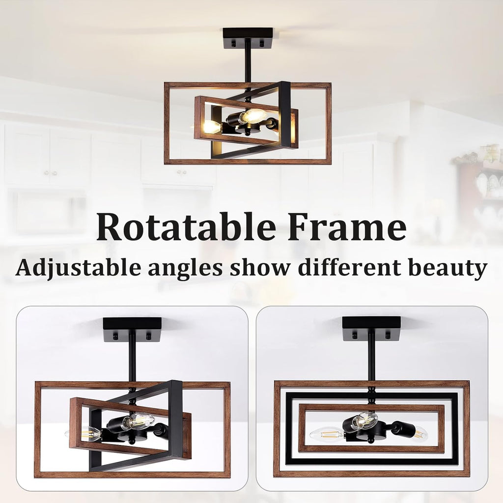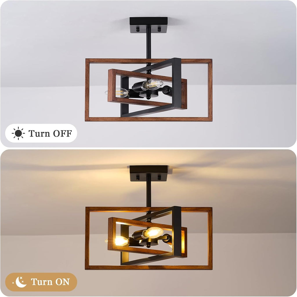 Add a bold and stylish industrial flair to your interiors with this Black 3-Light Semi Flush Mount Ceiling Light. Designed with intersecting geometric frames in matte black and woodgrain tones, this retro chandelier combines vintage charm with modern elegance. With E14 bulb compatibility and wide applicability across rooms, this fixture is perfect for living rooms, bedrooms, hallways, and kitchens. Built for durability and easy installation, it's the ideal lighting upgrade for modern and classic spaces alike.