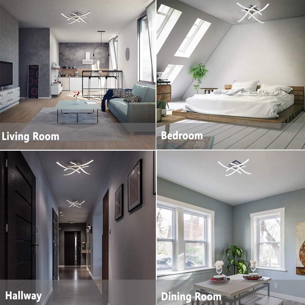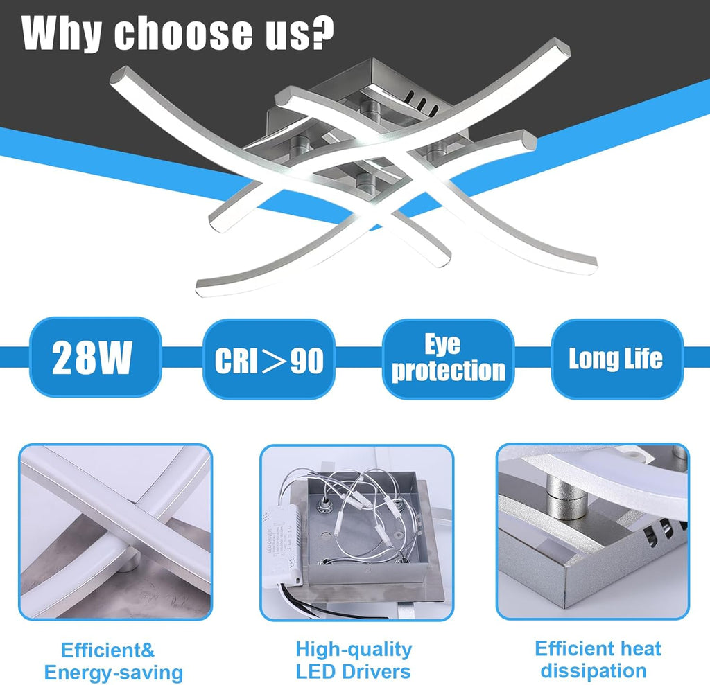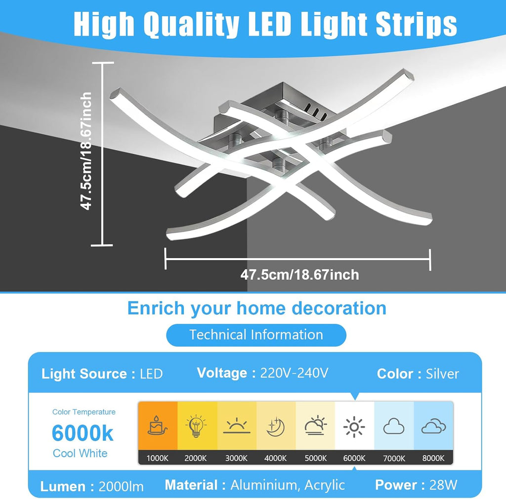 Brighten your home with the sleek elegance of this Modern LED Ceiling Light, featuring a contemporary wave design with 4 integrated LED boards. Crafted with high-quality aluminum and a matte metal finish, this 28W ceiling fixture delivers powerful 6500K cool white light at 2400 lumens—perfect for modern interiors. Easy to install and energy-efficient, it’s an ideal lighting solution for bedrooms, living rooms, kitchens, and more.
