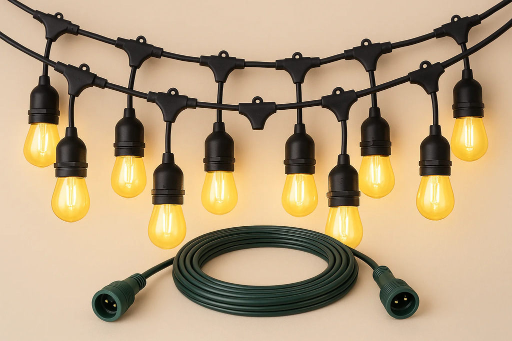 Bring warm elegance to your outdoor spaces with these 48ft LED Filament Festoon Lights featuring vintage-style S14 Edison bulbs. Each 15-meter strand includes 15 clear PC bulbs with a soft 180-lumen glow and a cozy 2700K warm white temperature. The flat, slim-profile design with E27 bases and built-in hanging loops ensures a neat, flush fit—ideal for patios, gardens, weddings, and commercial venues.