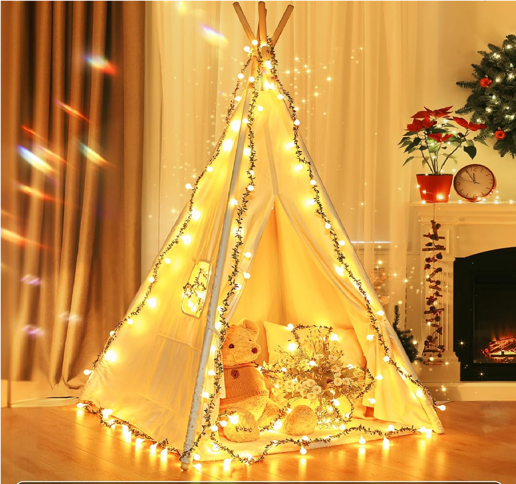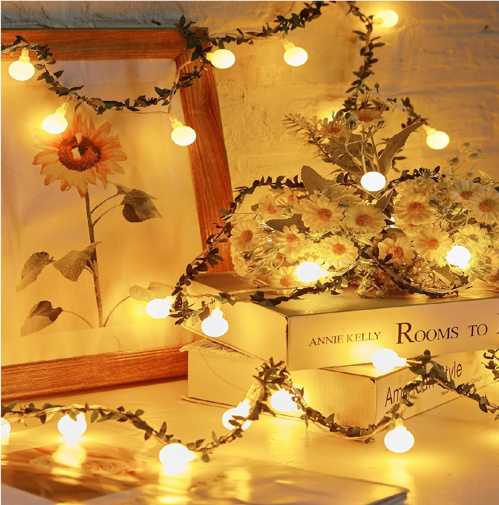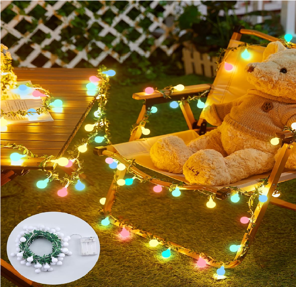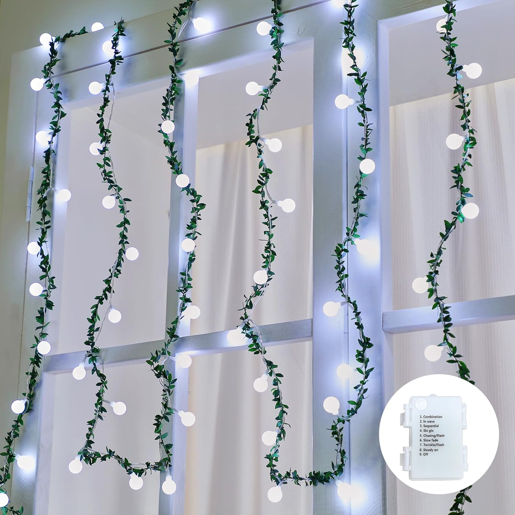 Create a nature-inspired glow with the Battery Operated String Lights. Measuring 19.6ft, this string includes 60 LED globe bulbs interwoven with artificial green vines, perfect for bedroom ambiance. The battery-powered design offers easy placement and a cozy decorative touch.