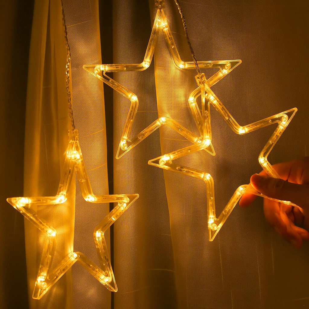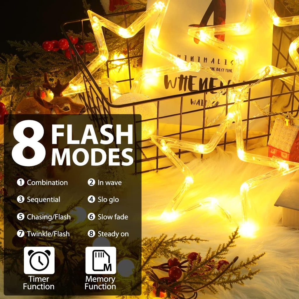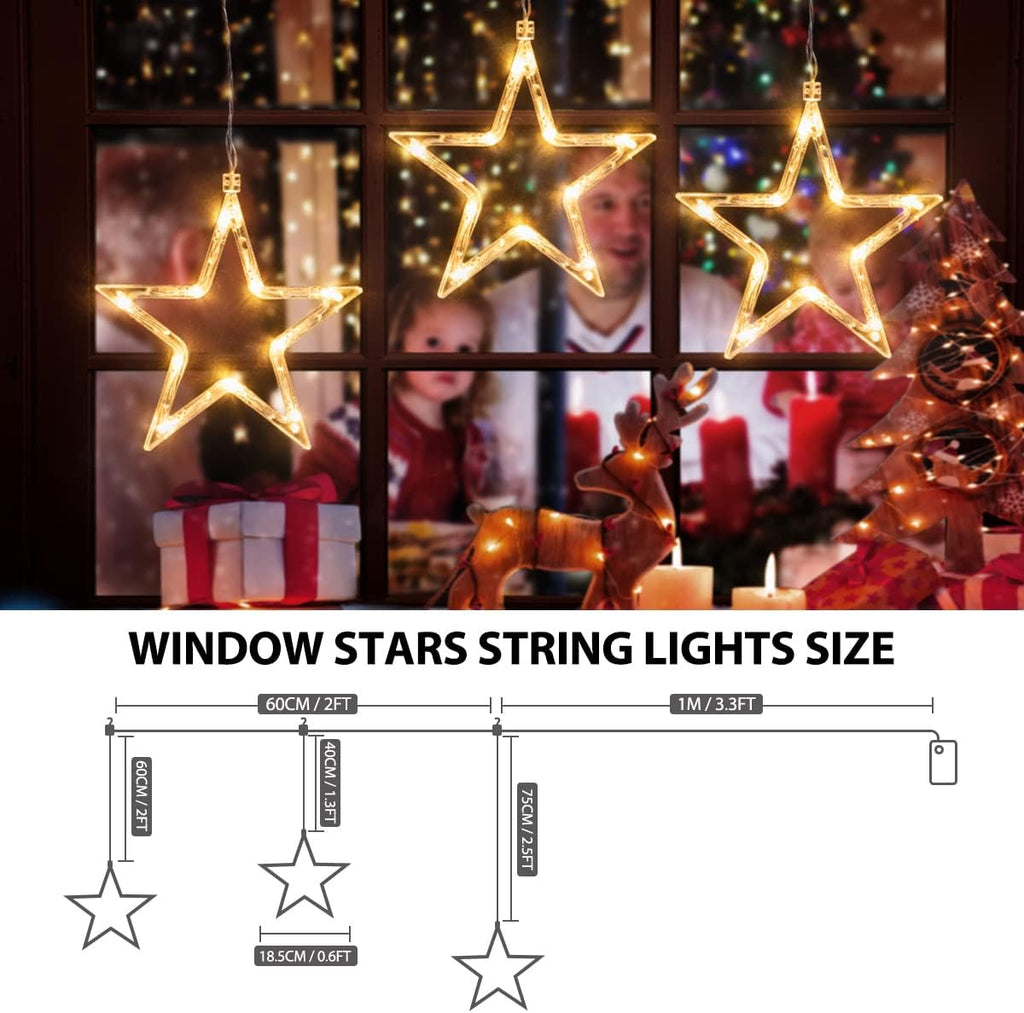 Brighten your holidays with these Christmas Window Star Lights featuring 3 glowing stars and 30 warm white LEDs. With 8 lighting modes (including Twinkle, Chasing, Slow Fade, and Steady On), you can create the perfect festive atmosphere for Christmas, New Year, weddings, or parties.