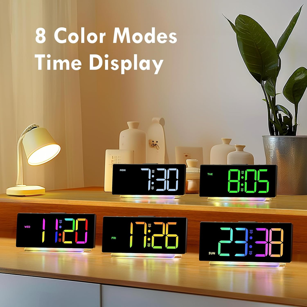 Add a touch of color and comfort to your room with this Modern Curved Digital Alarm Clock, designed to be both functional and stylish. Featuring an 8-color LED display and 7 RGB night light modes, it creates a calming atmosphere while providing clear time visibility at a glance.