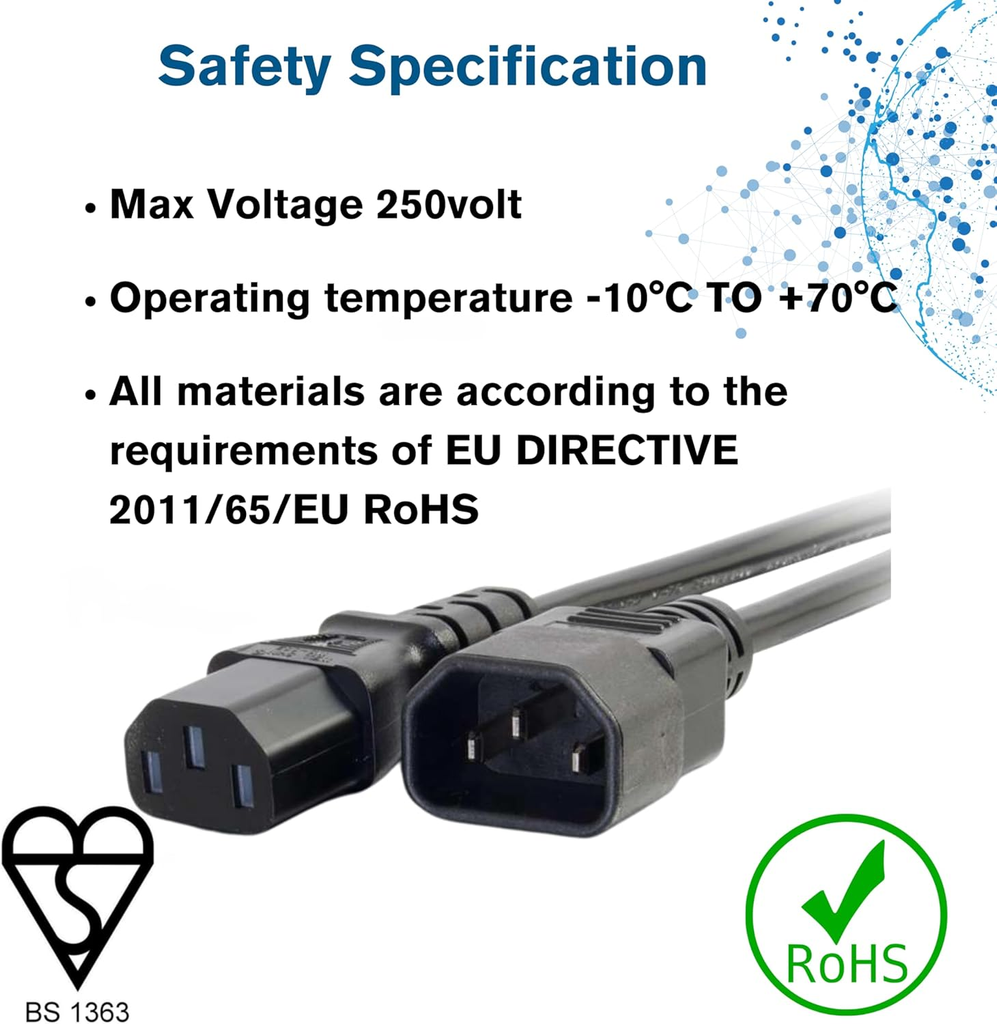 The 2 Metre IEC C13 to C14 Power Extension Cable is a reliable and durable solution for extending the reach of your computer, monitor, or server power connection. Made with 18 AWG pure copper wire, it ensures efficient power transmission and long-lasting performance. Compatible with standard IEC320 C13 and C14 connectors, this cable is ideal for connecting devices such as PCs, UPS systems, projectors, monitors, and printers.