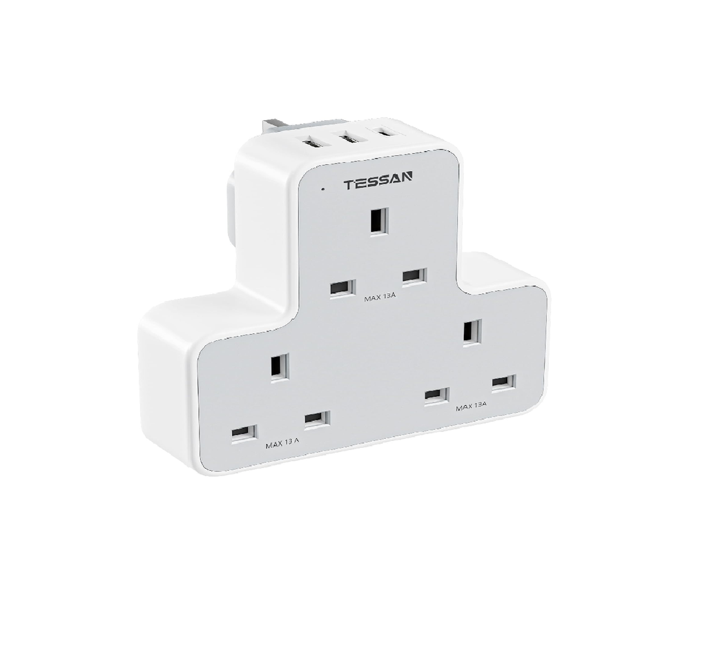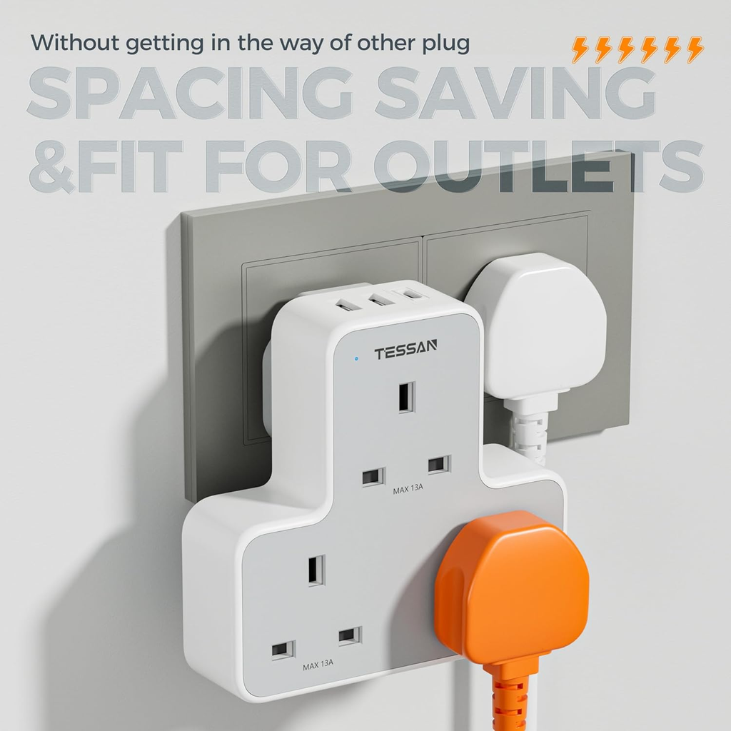 3-Way Extension Plug Socket with USB Ports, Multi Plug Power Strip for Home & Office