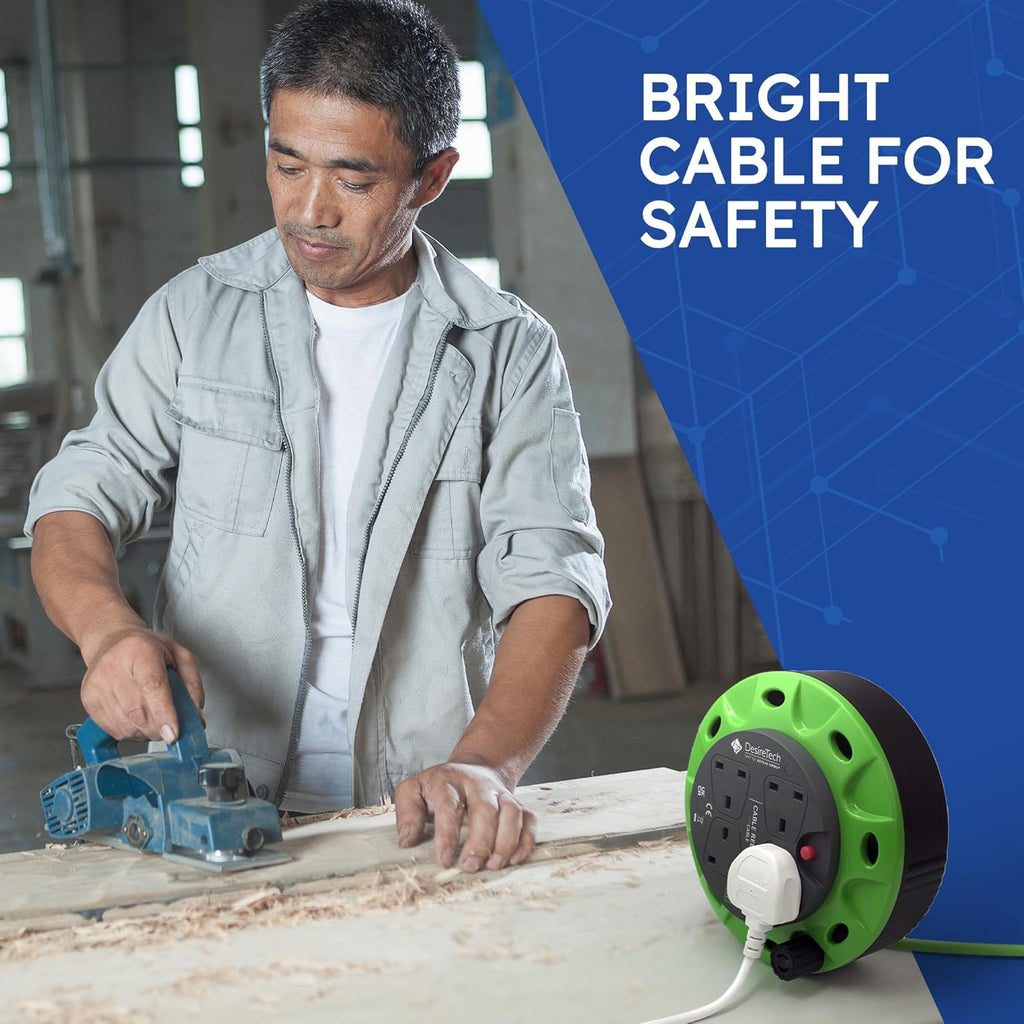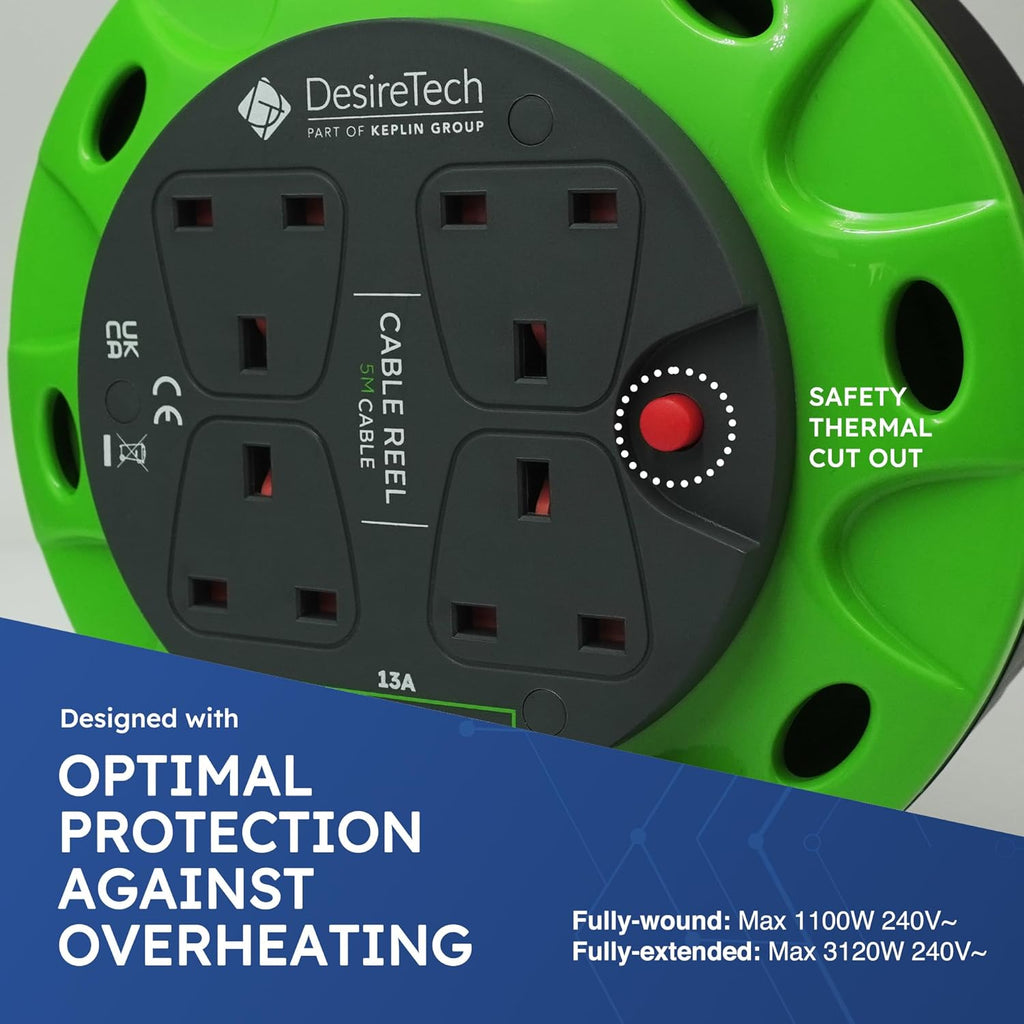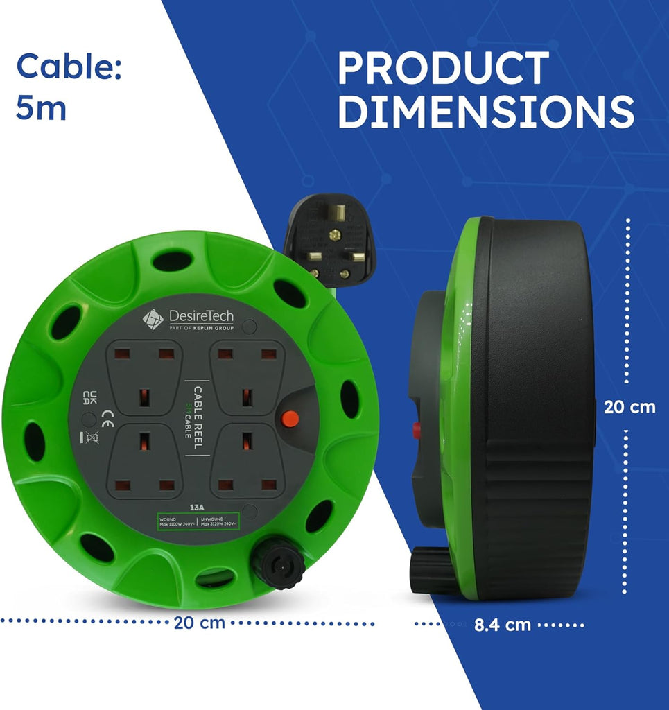 4-Socket 5M Cable Reel Extension Lead, Heavy Duty with Thermal Cut-Out – Green/Black