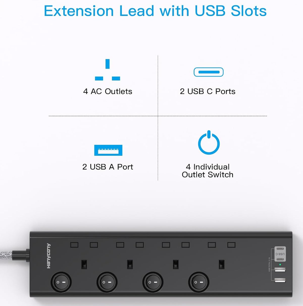 Upgrade your charging setup with this 4-Way Extension Lead featuring 4 USB ports (including 2 USB-C fast chargers) for all your home and office power needs. Designed for efficiency and convenience, this multi-socket power strip allows you to plug in multiple devices at once while charging your USB-powered gadgets without bulky adapters.