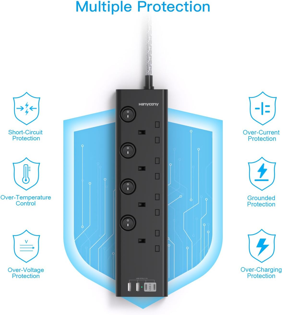 Each AC outlet has its own independent power switch, giving you full control over connected devices and helping reduce energy consumption. The built-in surge and overload protection ensures your valuable electronics — from laptops and TVs to smartphones and tablets — stay safe from power spikes and short circuits.