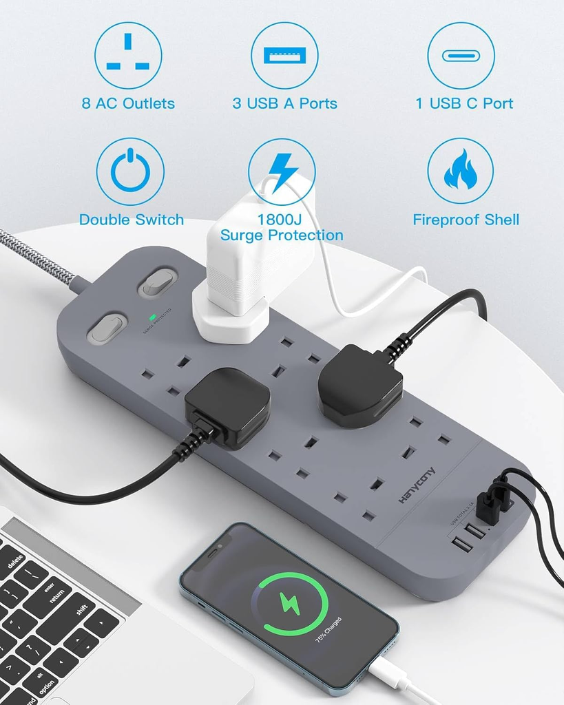 The 8-Way 5M Extension Lead Power Strip is a reliable and stylish solution for safely powering multiple devices at once. Featuring 8 AC outlets and 1800J surge protection, it shields your appliances, computers, and electronics from sudden power spikes or lightning strikes.