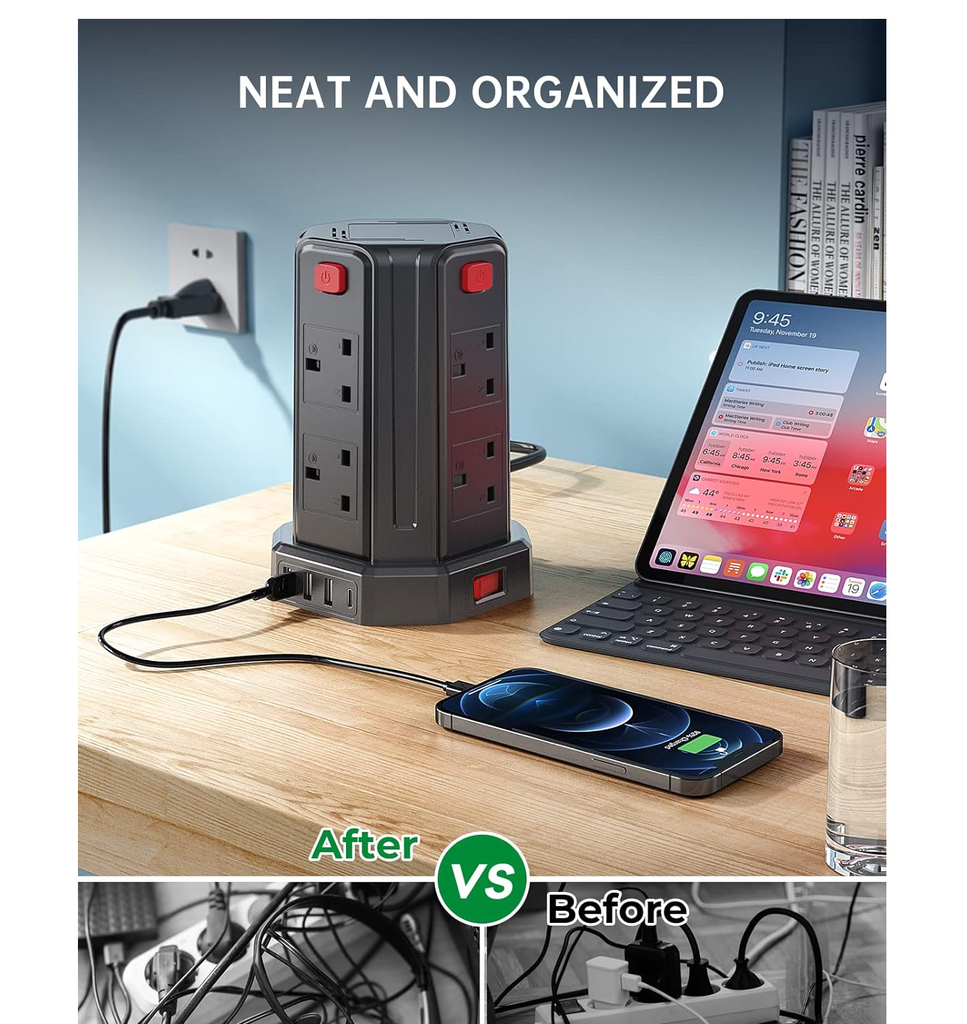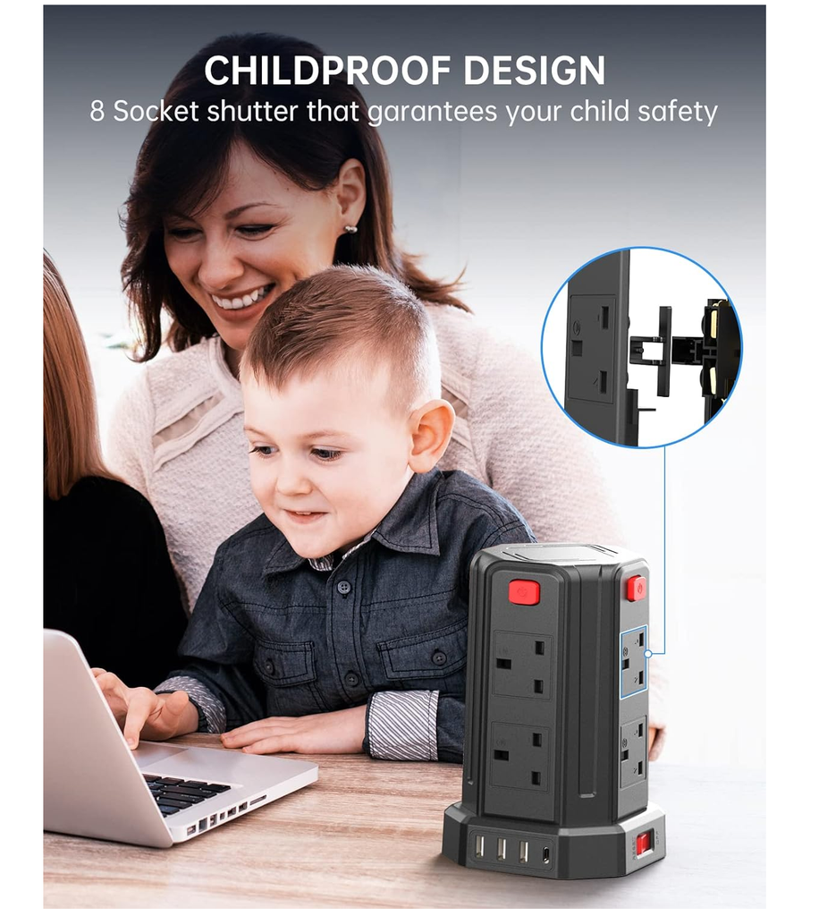 Built with 13A / 3250W high-capacity support and advanced surge and overload protection, it keeps your connected electronics safe from voltage fluctuations and short circuits. The 2-metre heavy-duty power cord provides flexibility and reach, while the vertical tower design saves valuable desk or floor space.