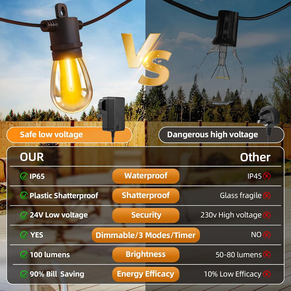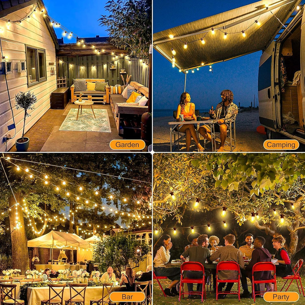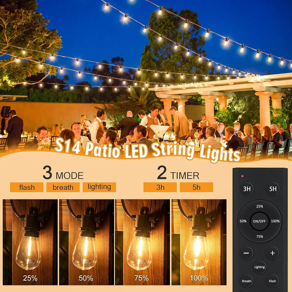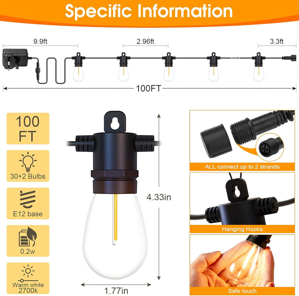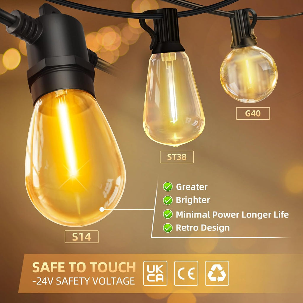 Illuminate your outdoor space with these elegant 150ft/45m Outdoor Festoon Lights, featuring 32 dimmable S14 LED bulbs and a handy remote control. Designed with durable shatterproof PET bulbs and an IP65 waterproof rating, these mains powered string lights withstand harsh weather conditions, making them perfect for patios, pergolas, gardens, and more. Enjoy customizable brightness and lighting modes to create the perfect atmosphere for any occasion.