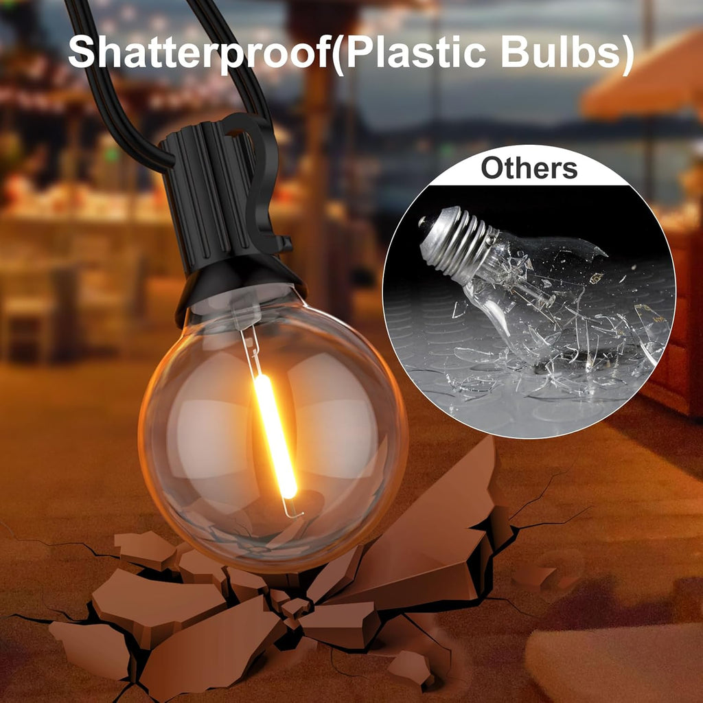 Illuminate your outdoor spaces in style with these 30M/100FT Outdoor Festoon String Lights. Equipped with energy-efficient and shatterproof G40 LED bulbs, these IP44 waterproof string lights are ideal for patios, gardens, pergolas, and special occasions. With built-in timer functionality and connectable design, they’re a perfect blend of durability, ambiance, and convenience.