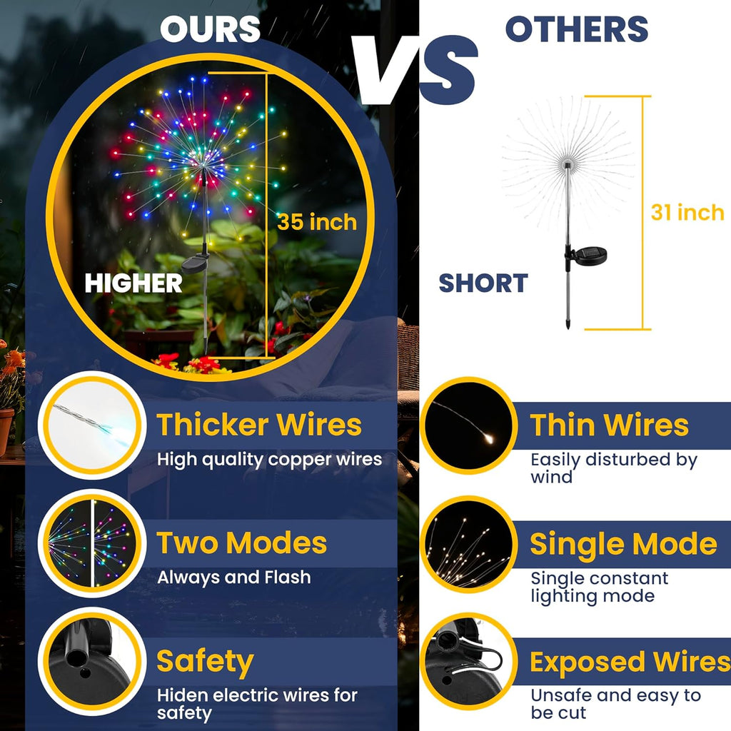 Each firework light features bendable branches, allowing you to DIY creative shapes such as hearts, stars, or flowers for a personalized touch. Built with IP65 waterproof protection, these solar garden lights can withstand rain and outdoor conditions, ensuring long-lasting performance throughout the year.