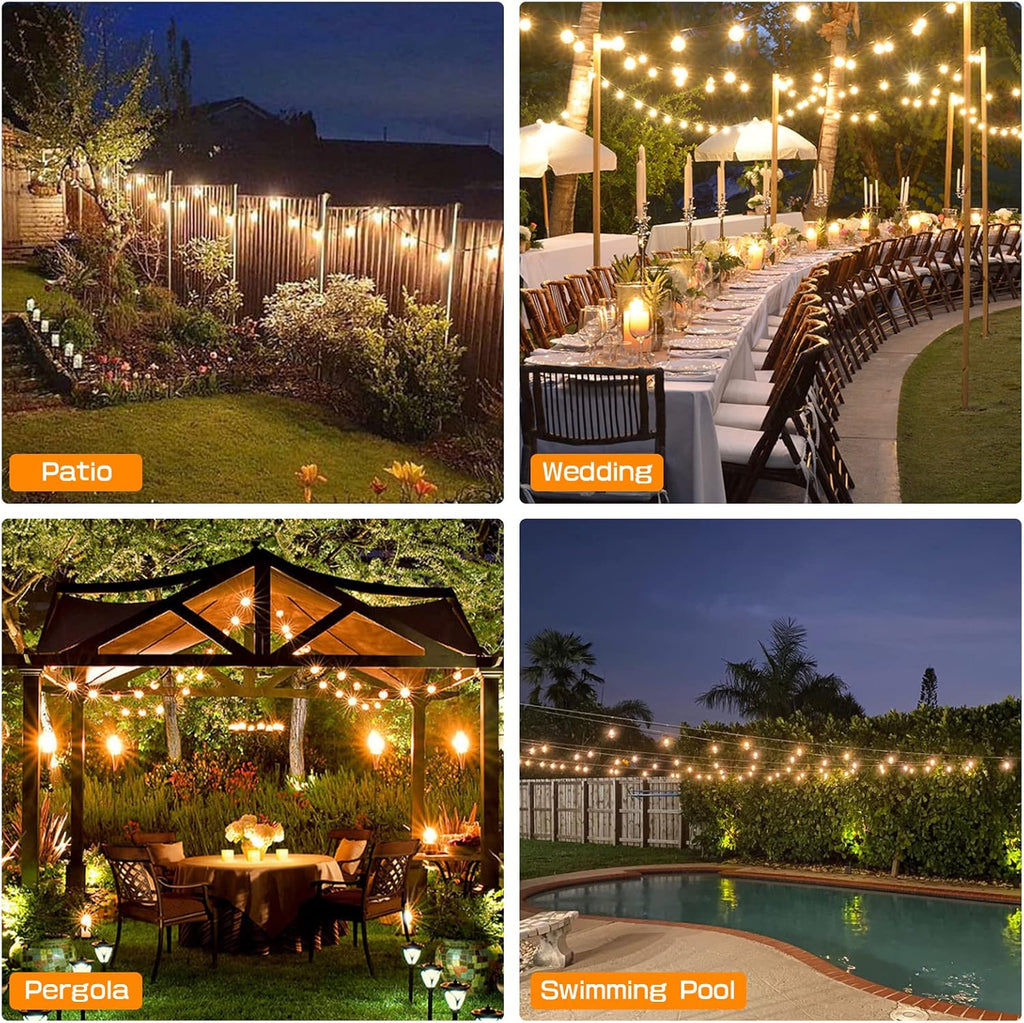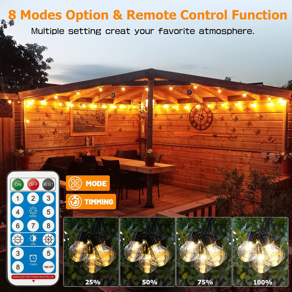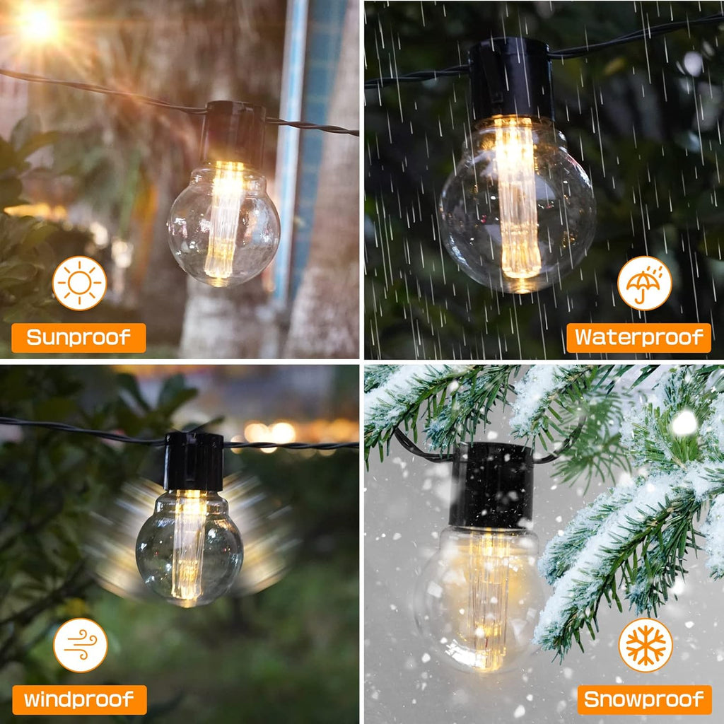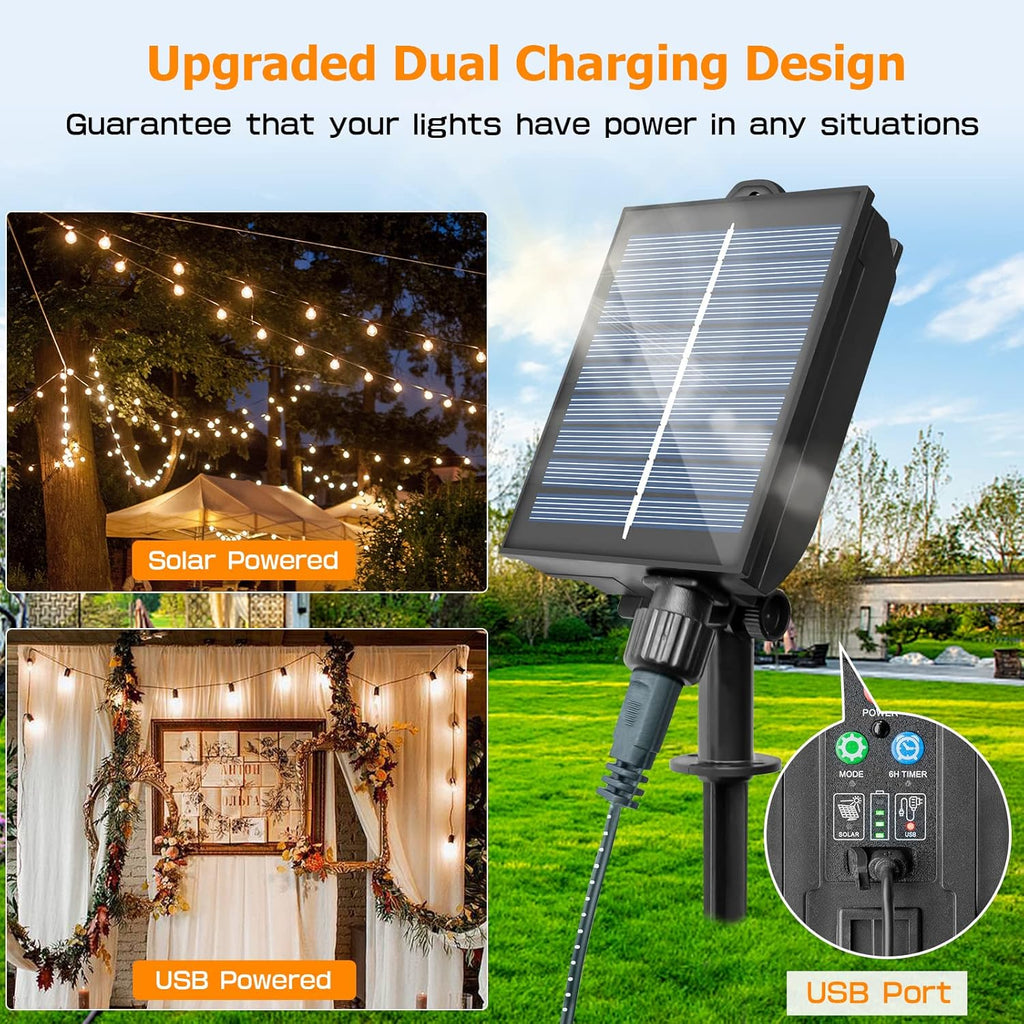 Illuminate your outdoor spaces with these upgraded 9-meter Solar Festoon Lights featuring 20 warm white G50 bulbs. Designed for easy installation and versatility, these lights come with a solar panel and USB charging options, a remote control with multiple lighting modes and brightness levels, and a durable, weatherproof design. Perfect for patios, gardens, weddings, parties, and year-round outdoor decoration.