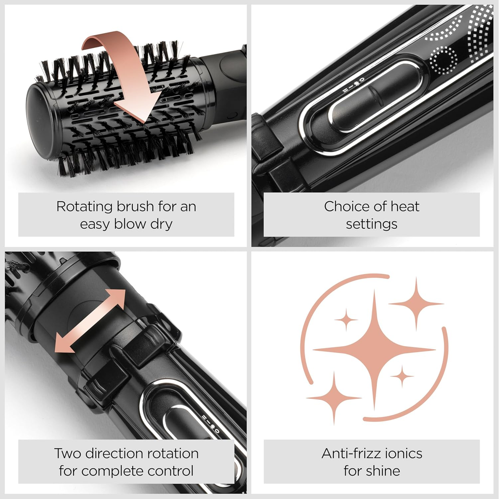 The dual-speed settings and alternating rotation directions allow you to create volume, body, and movement with complete control — whether you prefer sleek, straight styles or soft, natural curls. The ionic frizz-control technology emits negative ions that lock in moisture and reduce static, leaving hair silky and shiny with a smooth finish.
