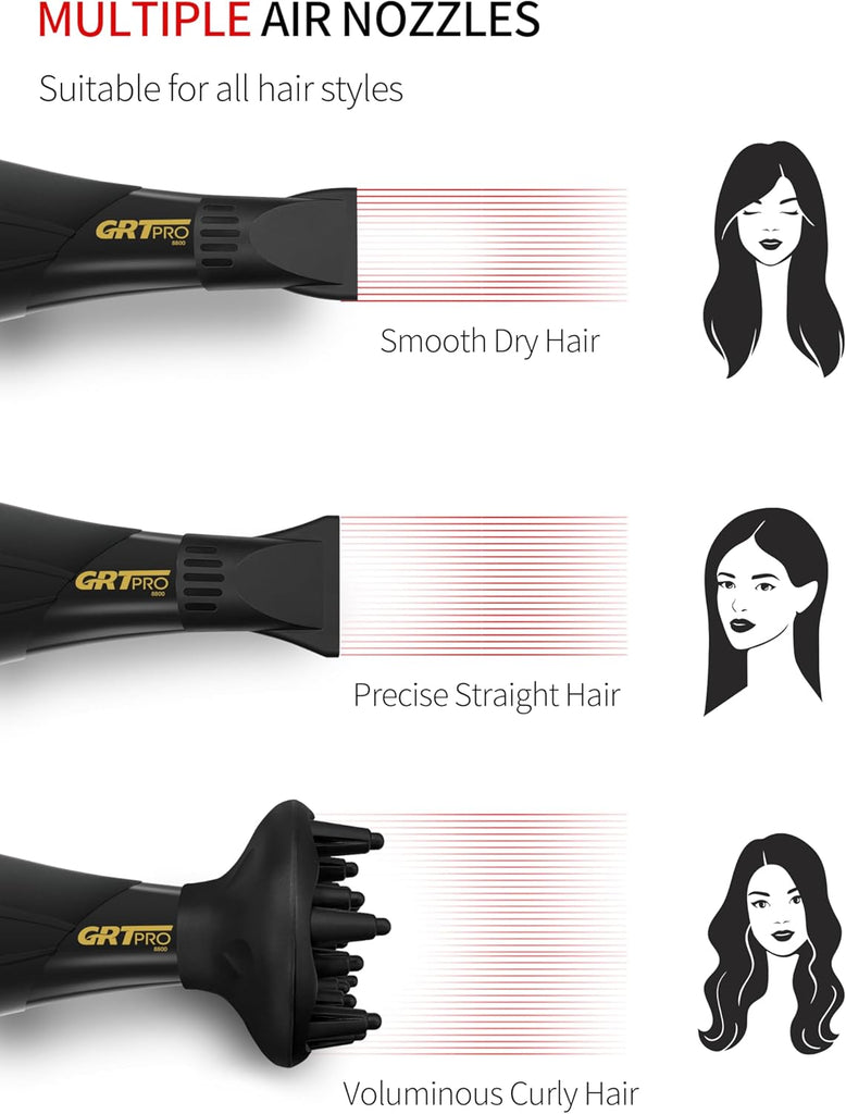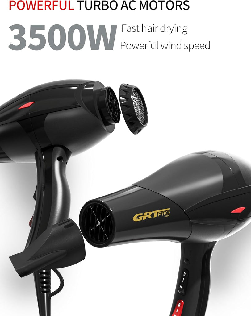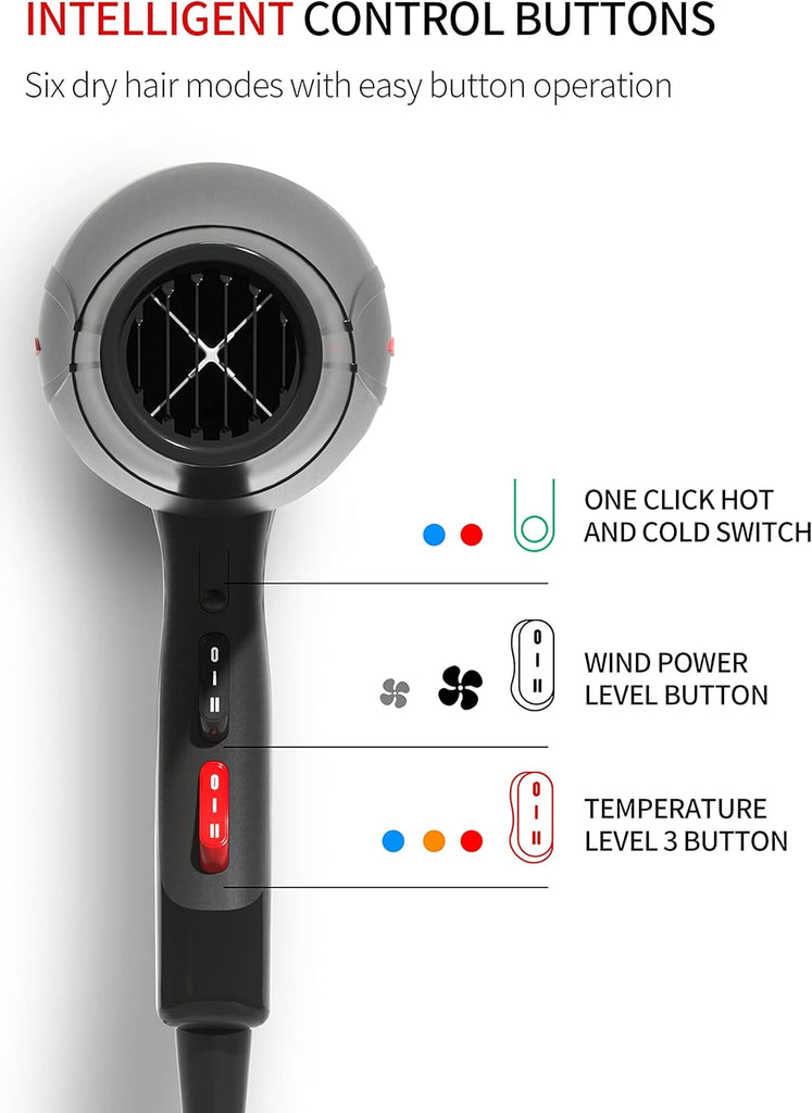 The Hair Dryer 3500W Ionic Hairdryer delivers powerful, professional-grade performance for fast and efficient drying. Equipped with a high-performance AC motor and blue light anion technology, it reduces frizz, enhances shine, and protects hair from damage. The dryer features 3 heat settings and 2 speed options, giving you full control for all hair types. Included attachments—1 diffuser and 2 concentrator nozzles—allow versatile styling for straight, wavy, or curly hair. Overheating protection ensures safe and reliable use, making it ideal for home or salon styling for both men and women.