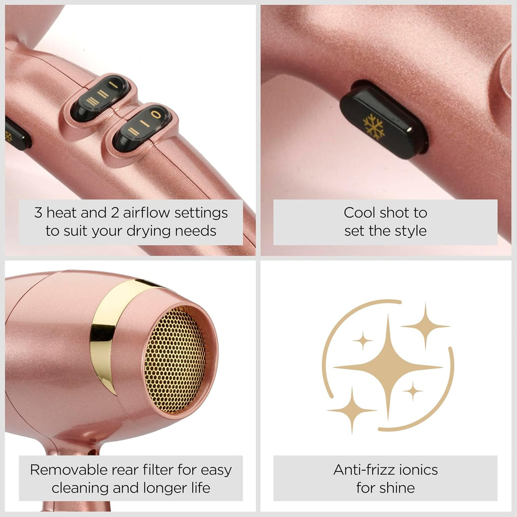 Achieve smooth, salon-quality results every day with the Rose Gold 2100W Professional Ionic Hair Dryer. Designed for fast, efficient drying, this lightweight blow dryer combines powerful airflow with advanced ionic and ceramic technology to reduce frizz, lock in shine, and protect your hair from heat damage. With 3 heat and 2 speed settings, you can easily customize your drying experience to suit your hair type — whether you need gentle styling for fine hair or powerful airflow for thick, coarse strands. The sleek rose gold and silver design adds a touch of elegance to your styling routine, while the ergonomic, lightweight build ensures comfortable use at home or on the go. Perfect for both travel and daily styling, this professional hairdryer delivers quick, glossy, and beautifully smooth results every time.