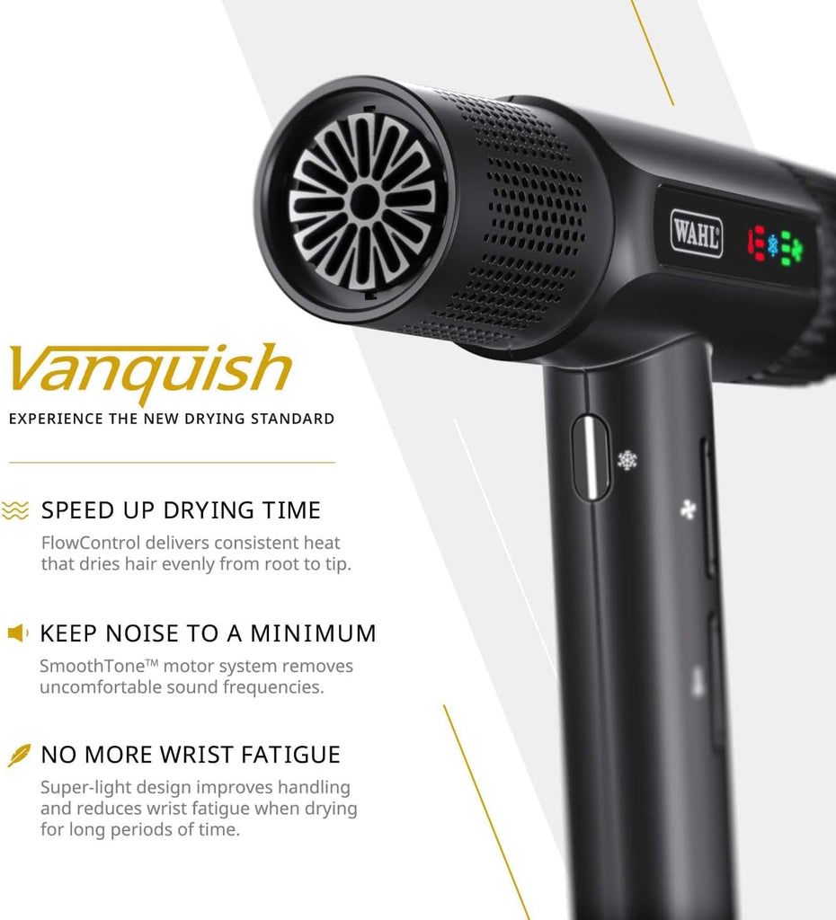 Experience salon-quality results at home with the Vanquish Hair Dryer, designed for professional performance while being lightweight and user-friendly. Its advanced LED display ensures precise control over speed and heat settings, while the quiet motor delivers a peaceful drying experience. Equipped with 3 versatile attachments, this hair dryer caters to all hair types, ensuring even drying and styling every time. The cool-dry function locks in shine and prevents heat damage, while the auto-clean system keeps your dryer performing optimally for years. Achieve fast, effortless drying without compromising on hair health.