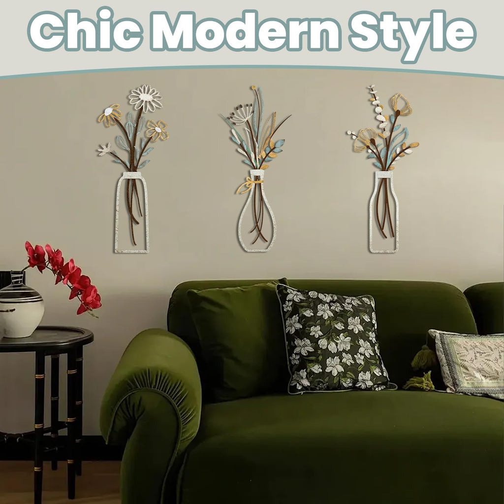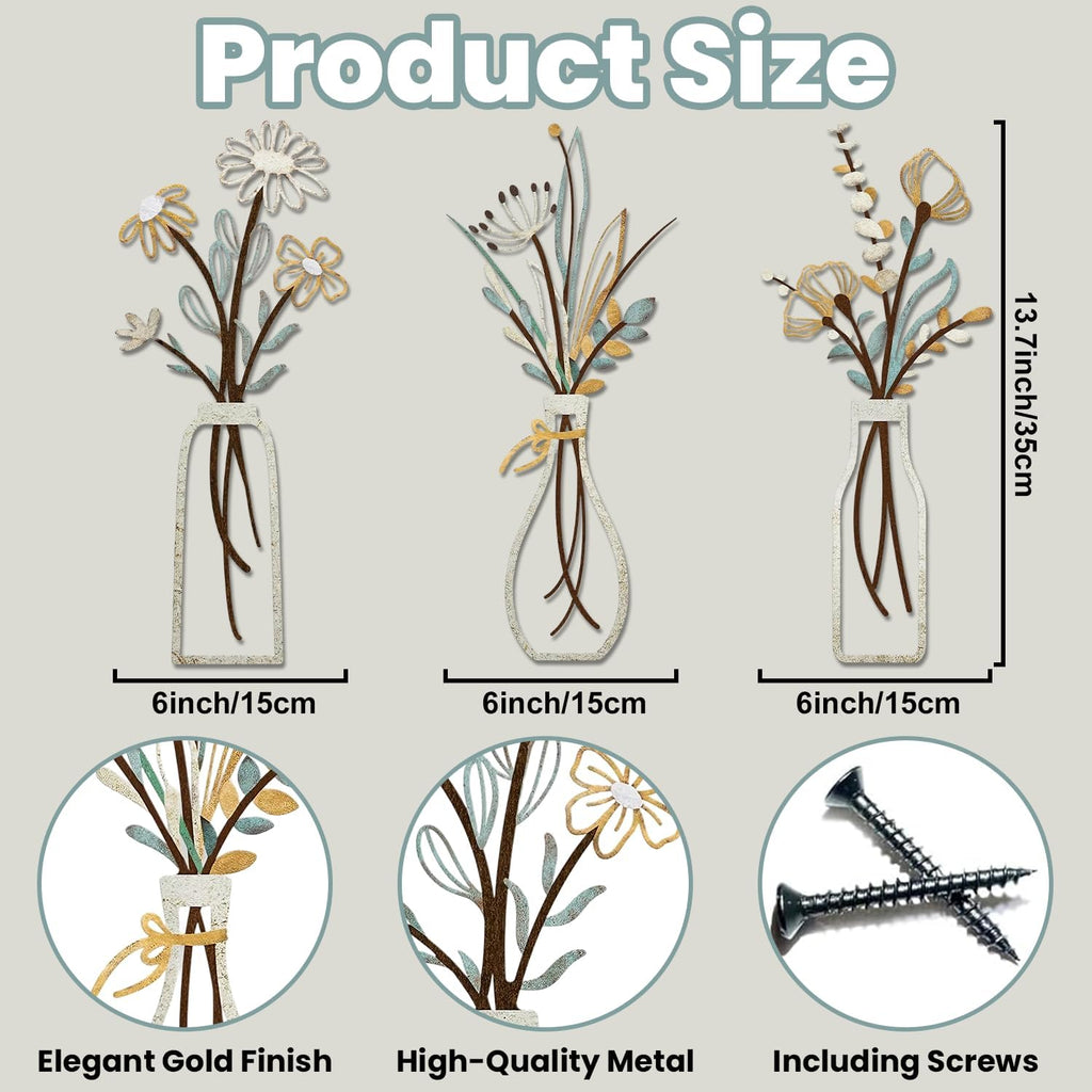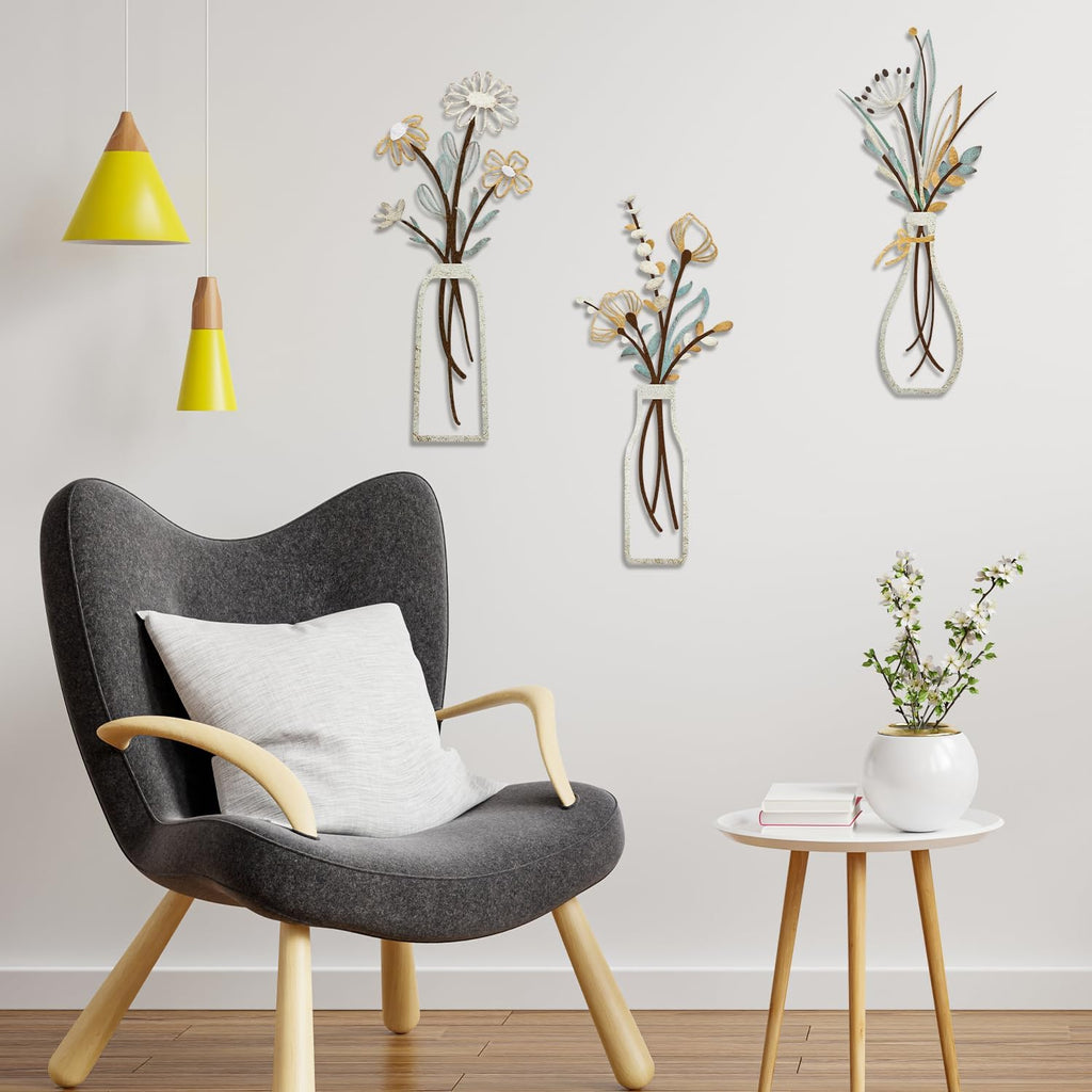 The package includes 3 unique metal flower wall art panels.