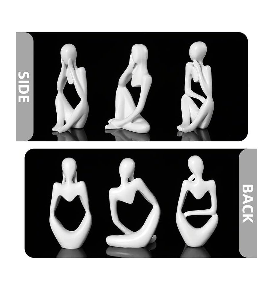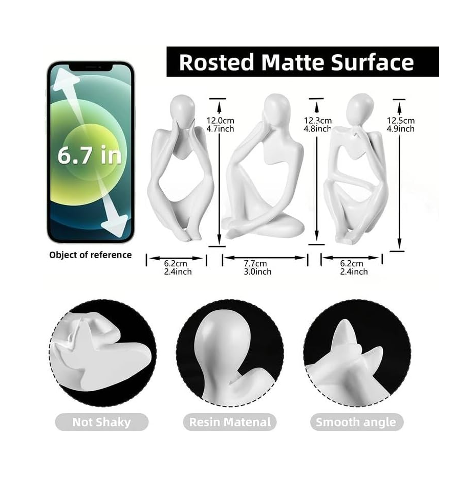 Bring sophistication and artistic charm to your space with the FARAMIR Thinker Statues Set of 3. These elegant white abstract figurines are crafted from premium resin, offering durability with a smooth, modern finish. Inspired by the classic "Thinker" pose, each statue adds depth and personality to your décor, making it perfect for shelves, coffee tables, offices, or bookshelves. Their minimalist yet artistic design blends seamlessly with modern, contemporary, or Scandinavian interiors. Whether displayed together as a trio or placed separately across different rooms, these statues elevate any space with style and creativity.